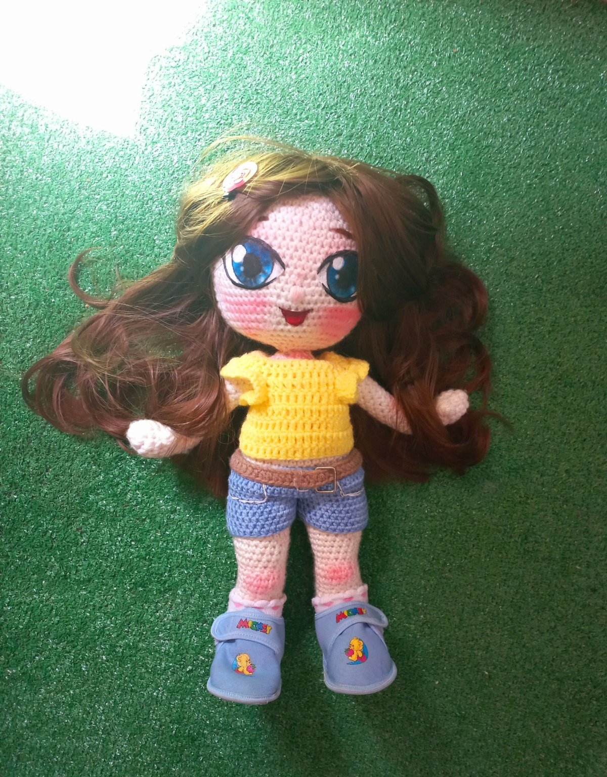 A very beautiful crochet doll, 45 cm long. Supported by an internal cord for easy movement. Long brown thermal hair. Separately worn, and multiple sets are available. Painted eyes and embroidered eyes are available. Completely safe for children.