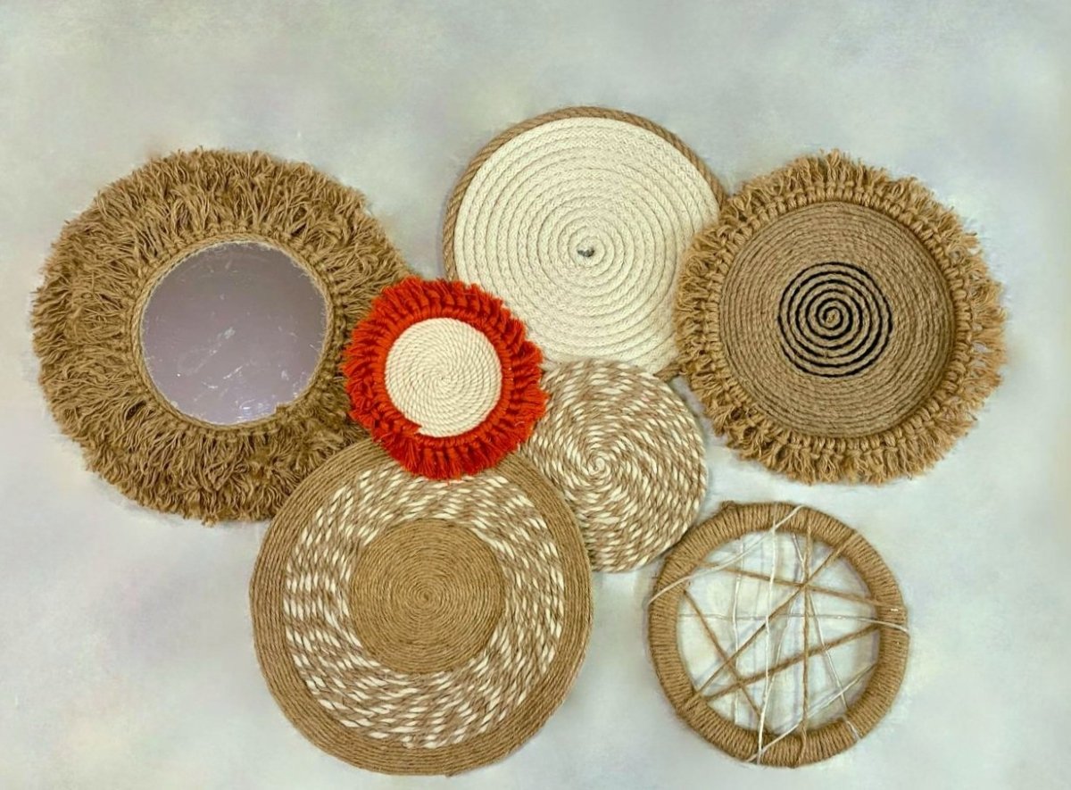 set of 6 coasters and mirror 30cm from jute and macrame coasters sizes : between 15-25cm