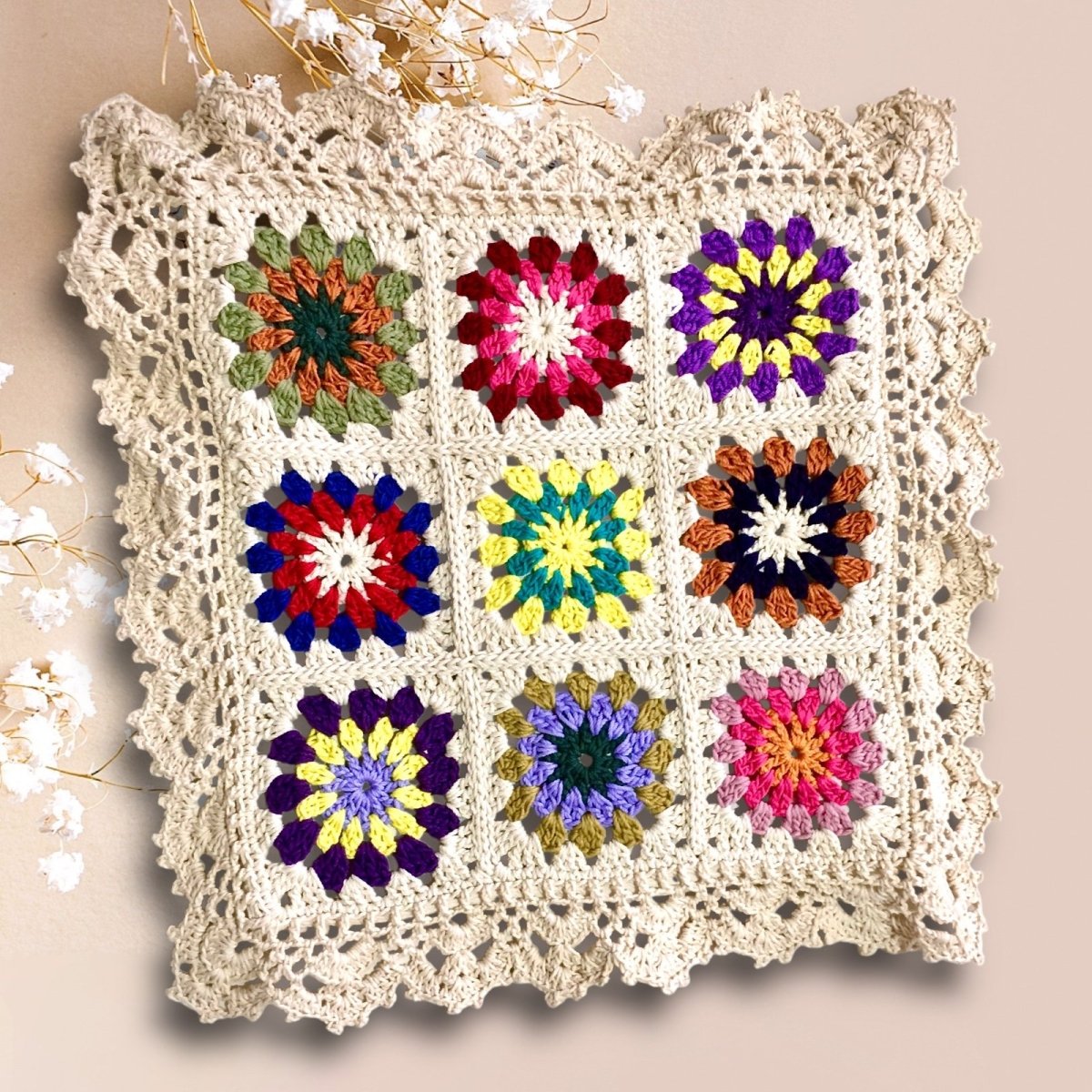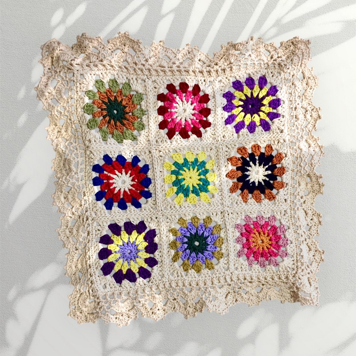 Crochet handmade Pillow case, made of heavy duty cotton yarn, Base color is off white and 9 colorful squares Dimensions 40 x40 cm