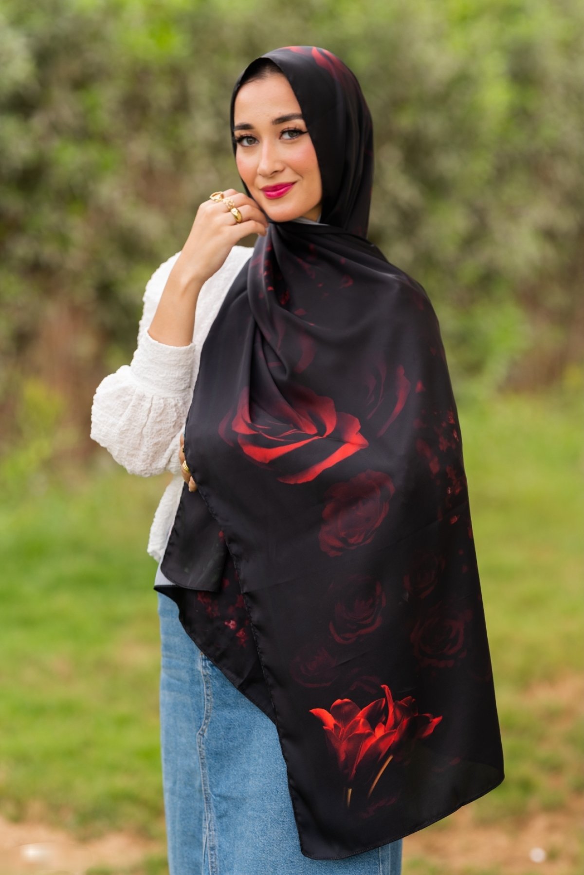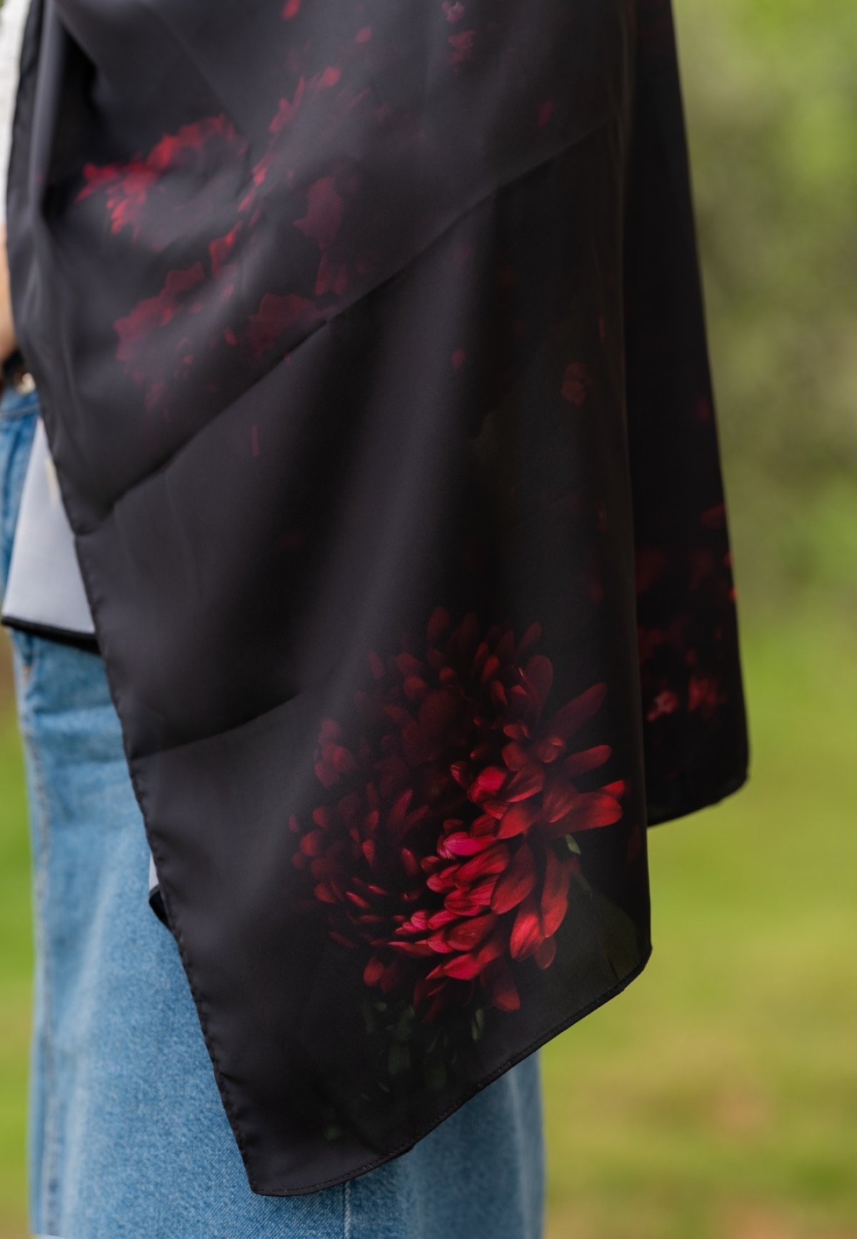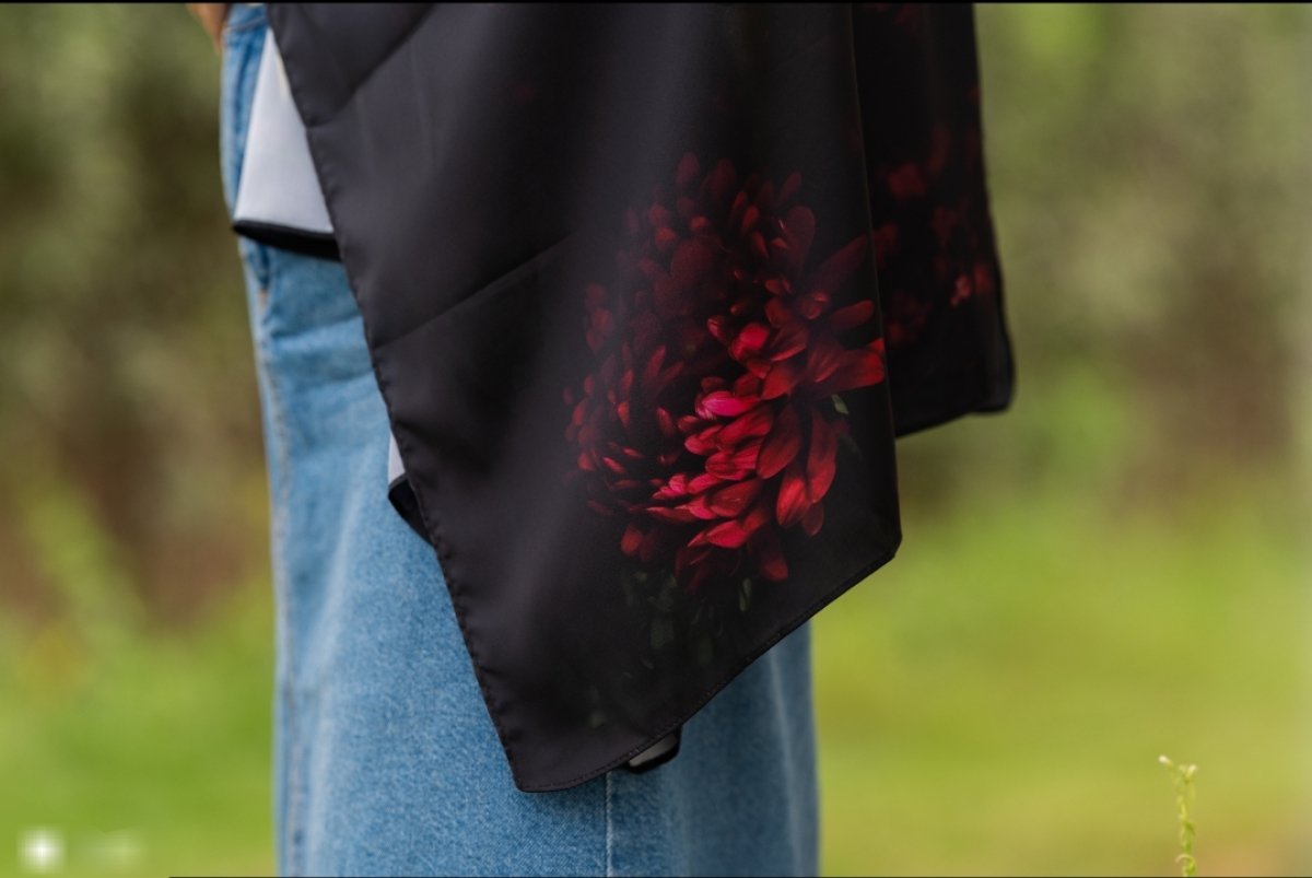 Discover the magic of elegance with the 'First Date' scarf, a stunning masterpiece crafted from luxurious silk satin in captivating black. Delicately adorned with vibrant red flowers, this scarf adds a touch of boldness and romance, ensuring you shine with confidence and allure at any evening event. This scarf is not just an accessory; it is a statement of elegance and courage, designed to make you stand out on your first date. Allow yourself to be the center of attention and the highlight of the night with this scarf that seamlessly blends luxury and boldness in an irresistible way.