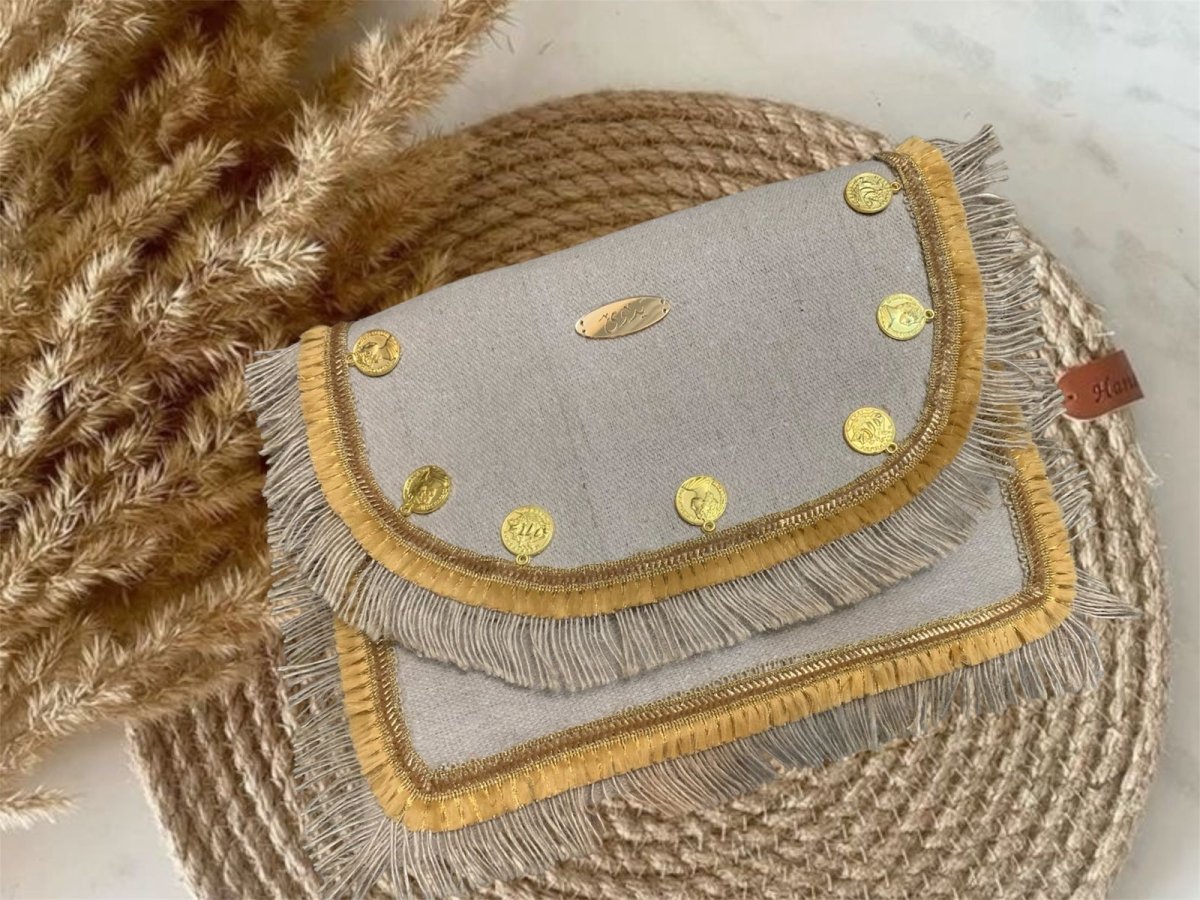 A clutch made of linen with a zipper, padded, and has a short strap on the side.