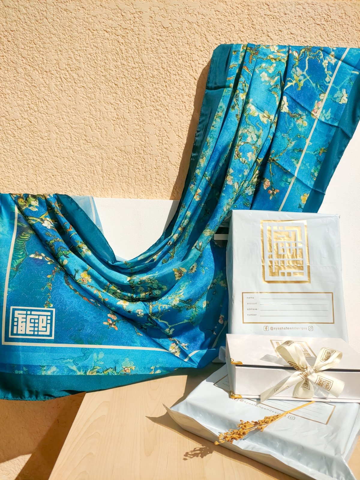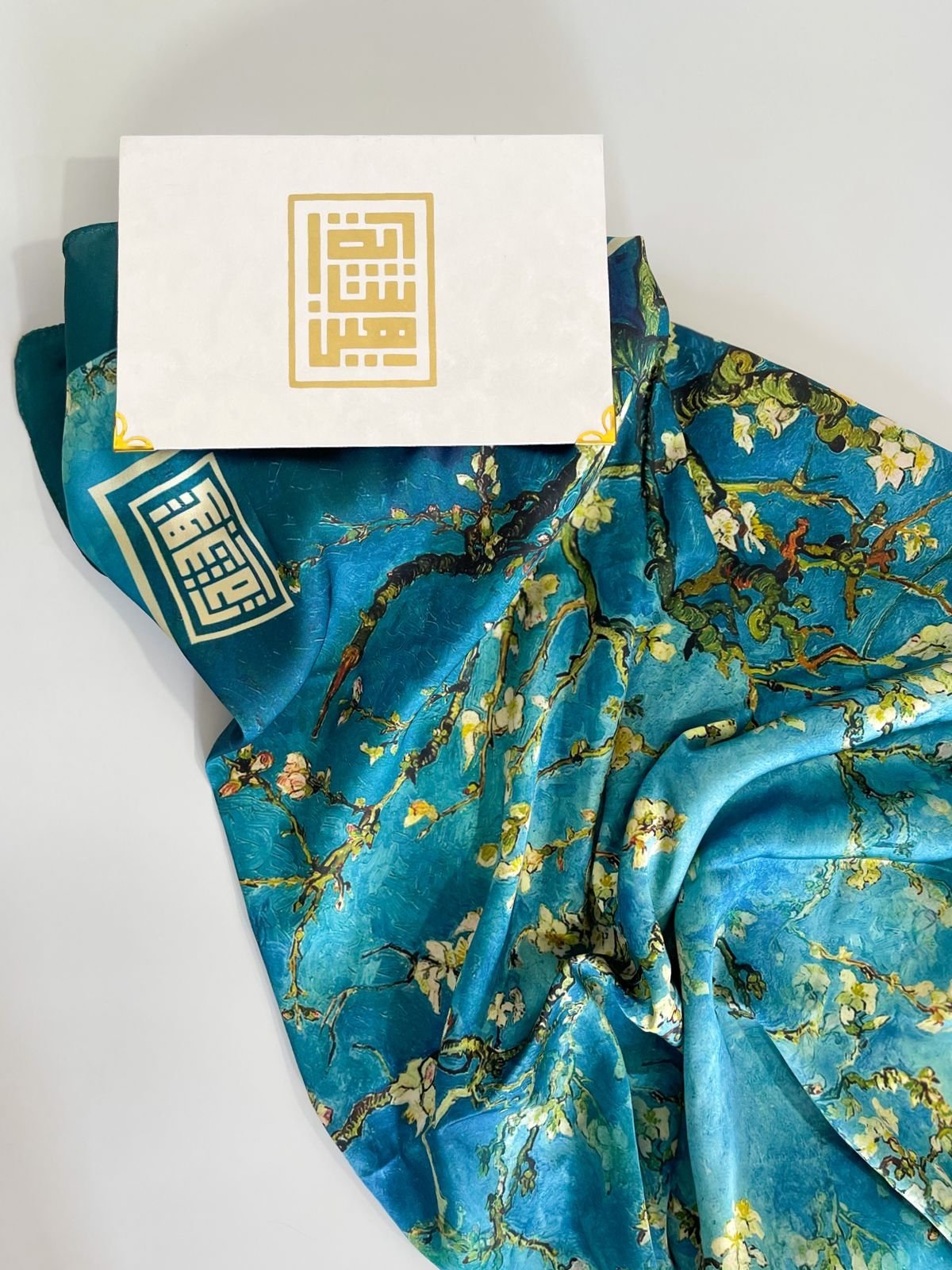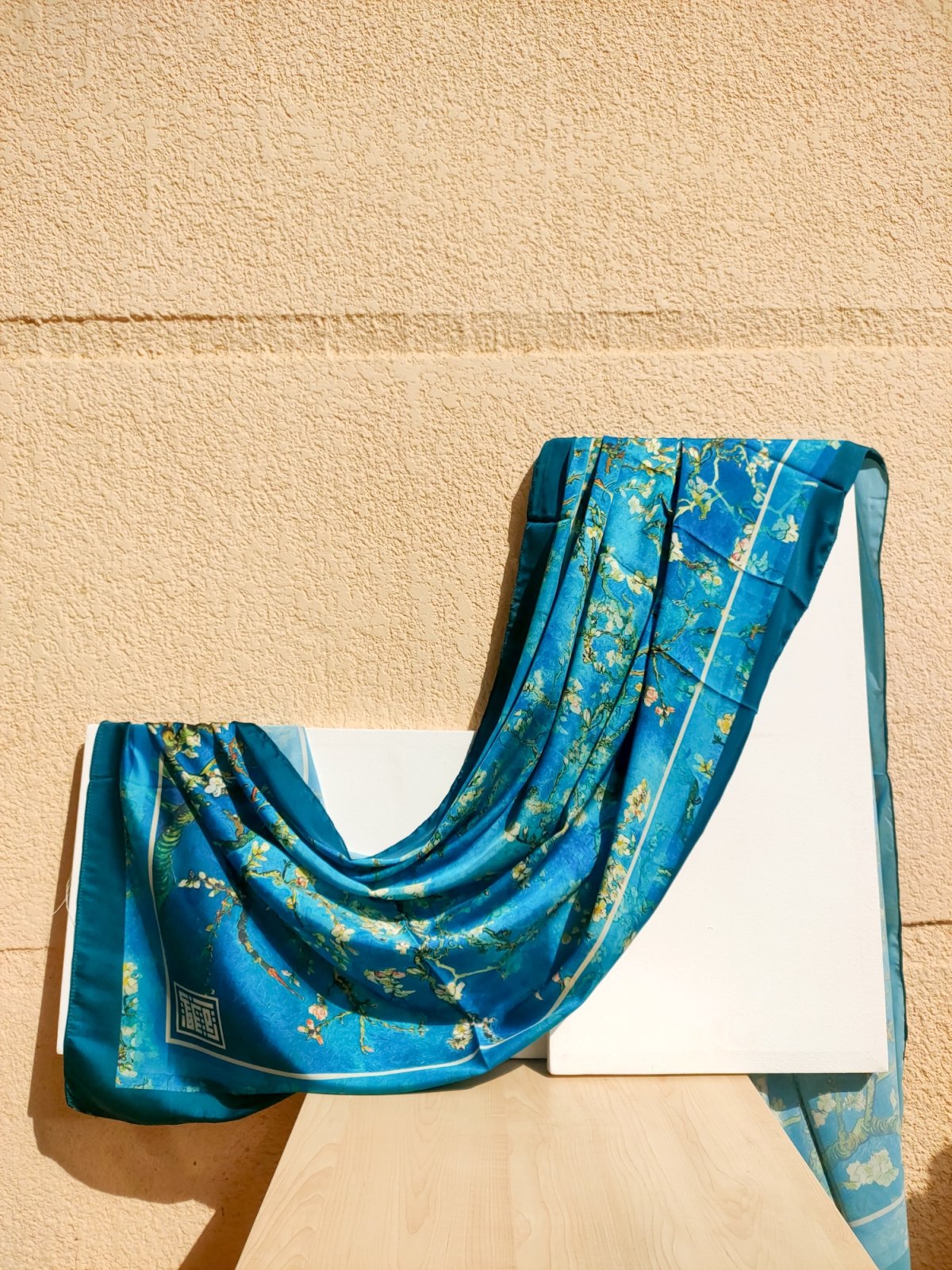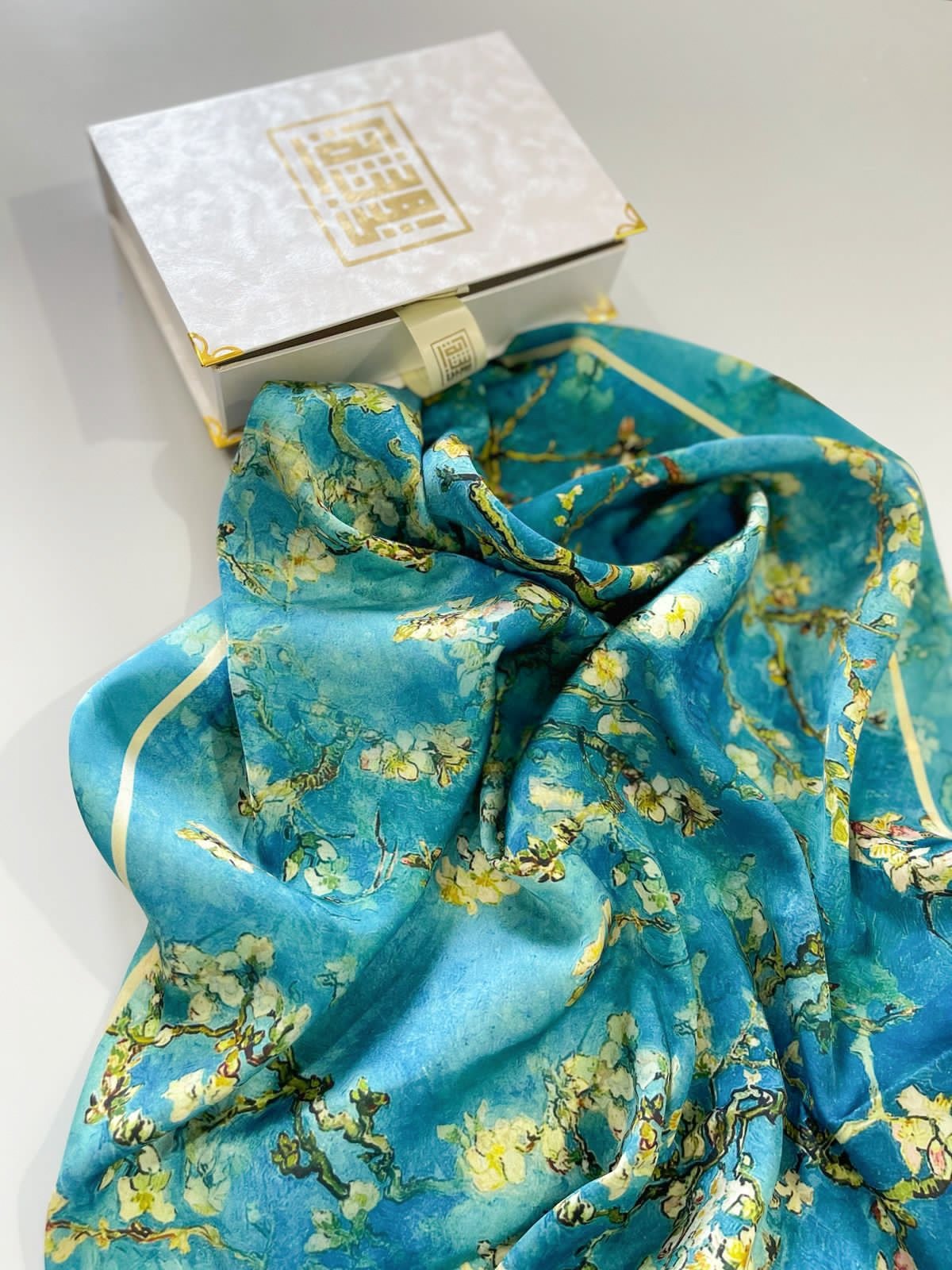 Embrace the splendor of art and the essence of spring with the 'Almond Blossom' scarf, inspired by the legendary artist Van Gogh's painting 'Almond Blossom'. This scarf is characterized by its serene colors and delicate design, reminiscent of the gentle blossoms of the almond tree, with shades of white and blue blending to create a stunning scene full of femininity and beauty. It embodies hope and natural beauty, making it the perfect choice to add a touch of elegance and sophistication to your daily look. Wear 'Almond Blossom' and let yourself shine with the beauty of art and the tenderness of flowers in every step.