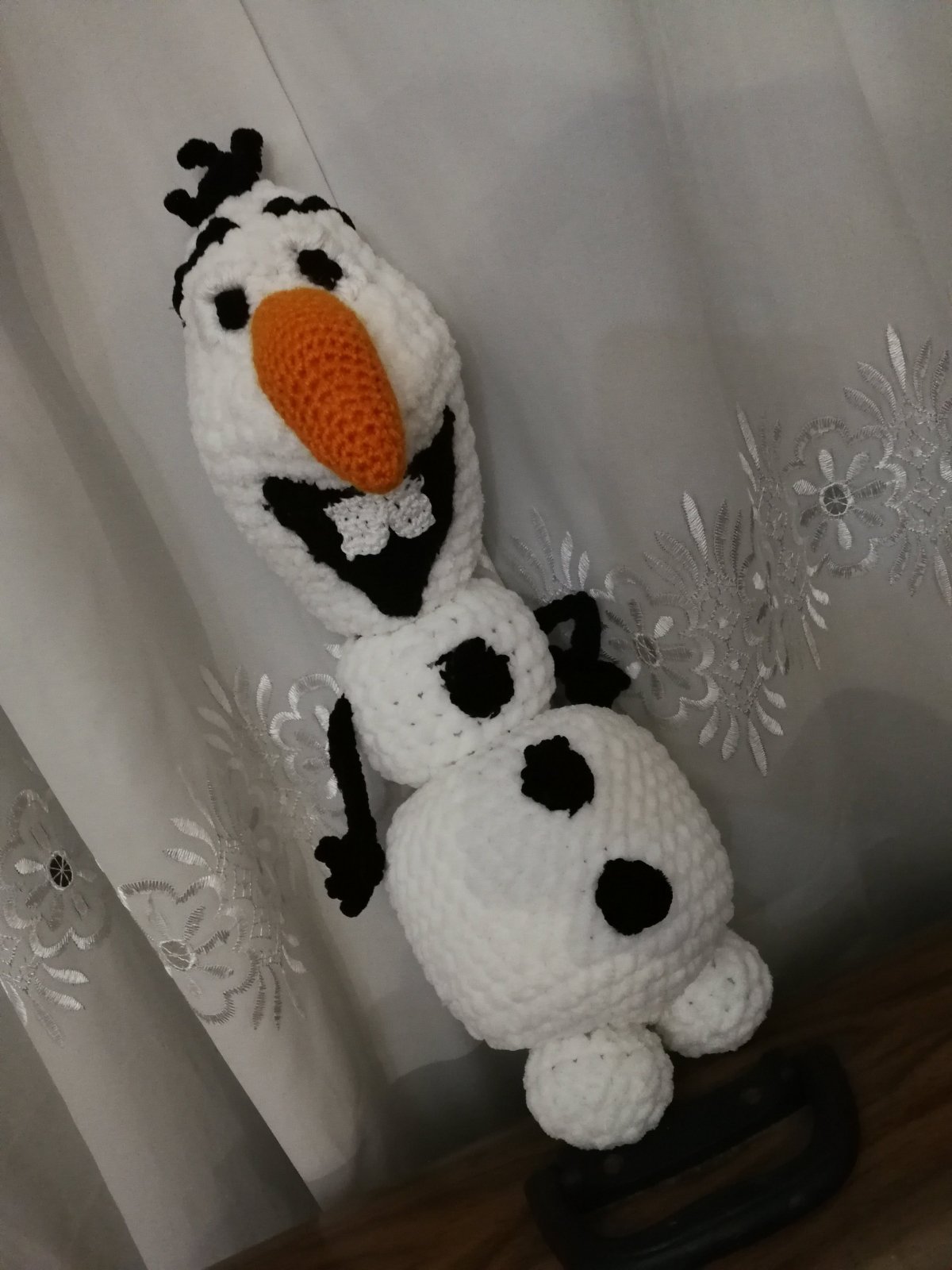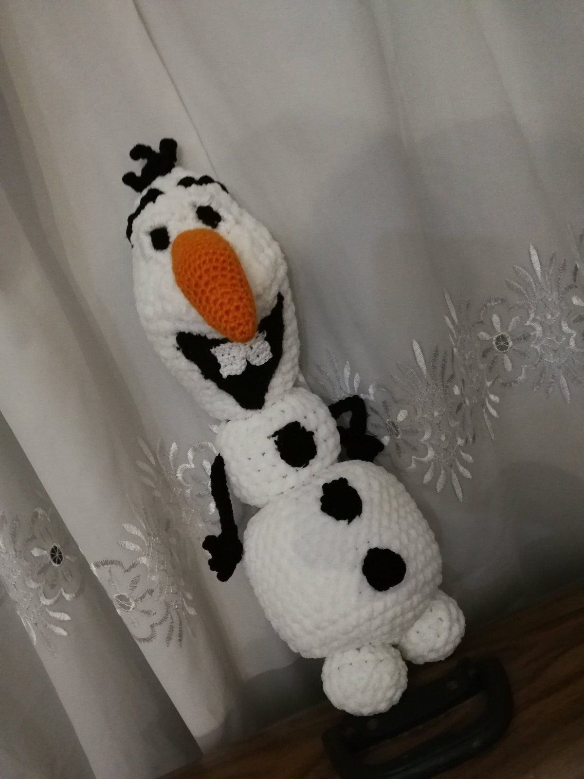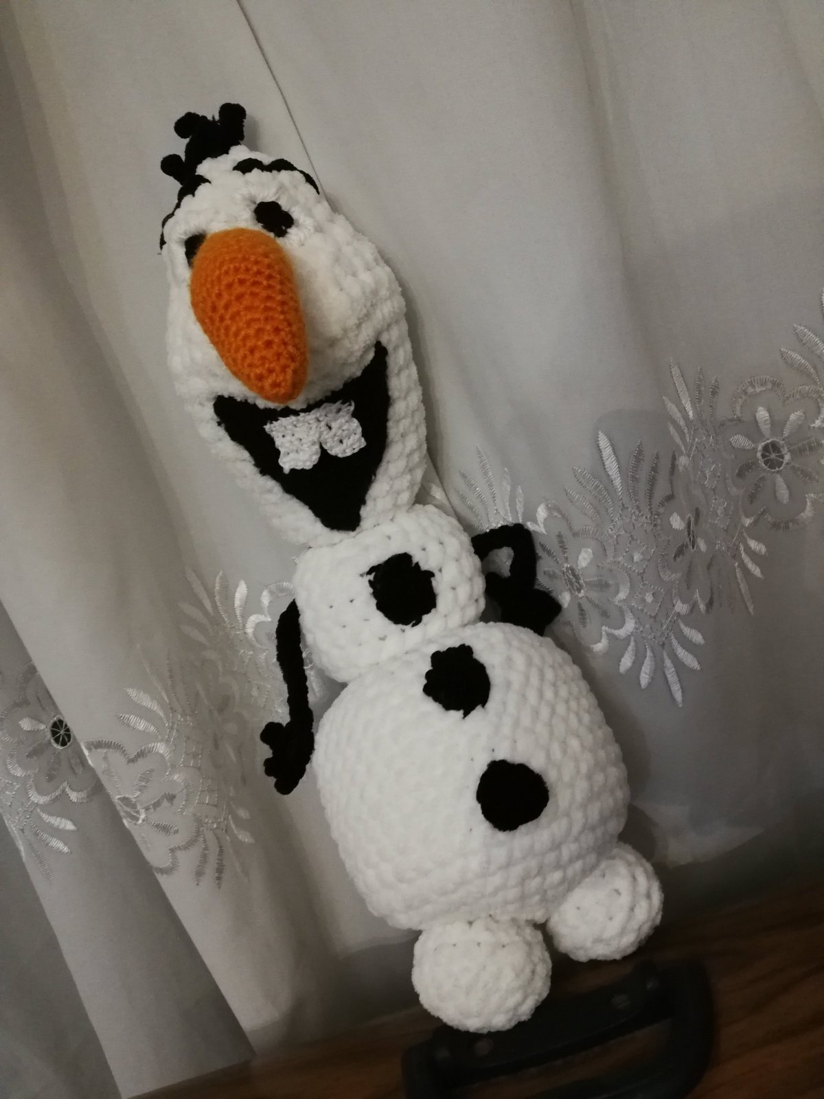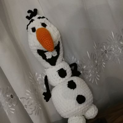 A stuffed crochet doll of Olaf the Snowman, inspired by the animated movie Frozen, Made of smooth velvet yarn, measures 40 cm