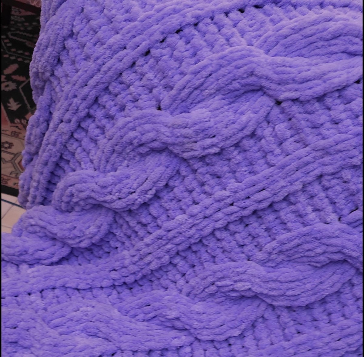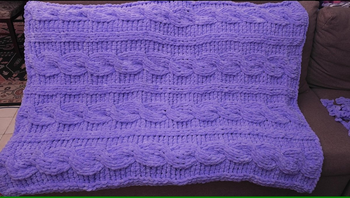 This hand-knitted blanket, crafted from smooth Puffy velvet yarn, measures 100x150 cm.