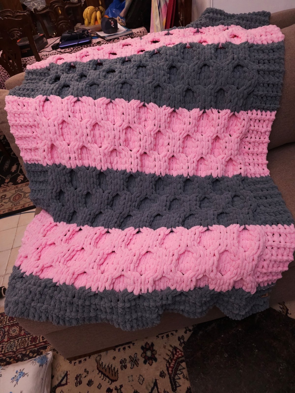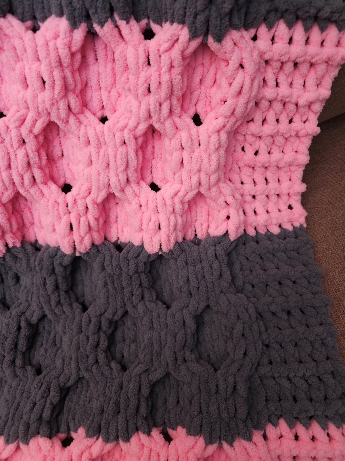 This hand-knitted blanket, crafted from smooth Puffy velvet yarn, measures 110x150 cm.