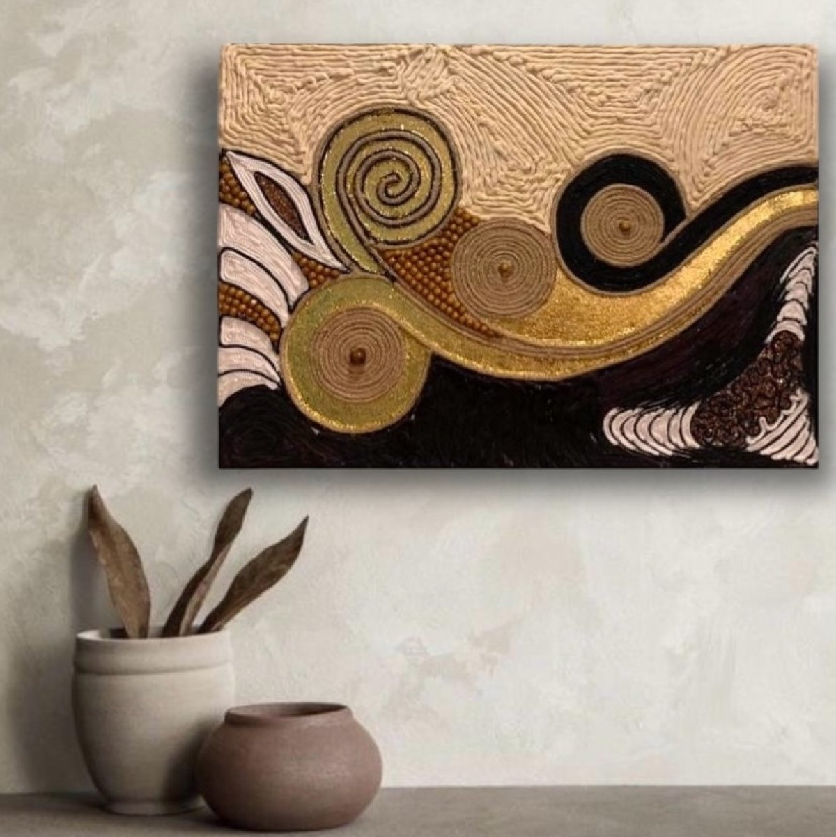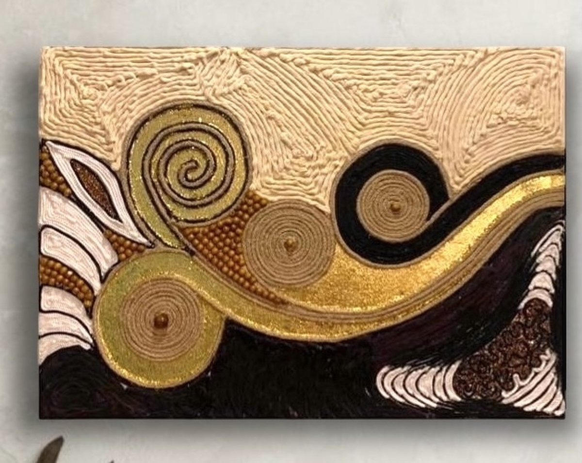 Hand made tableau made of threads, golden leaf, and other materials attached to fabric stretched on wooden frame. Size 80*60 cm.
