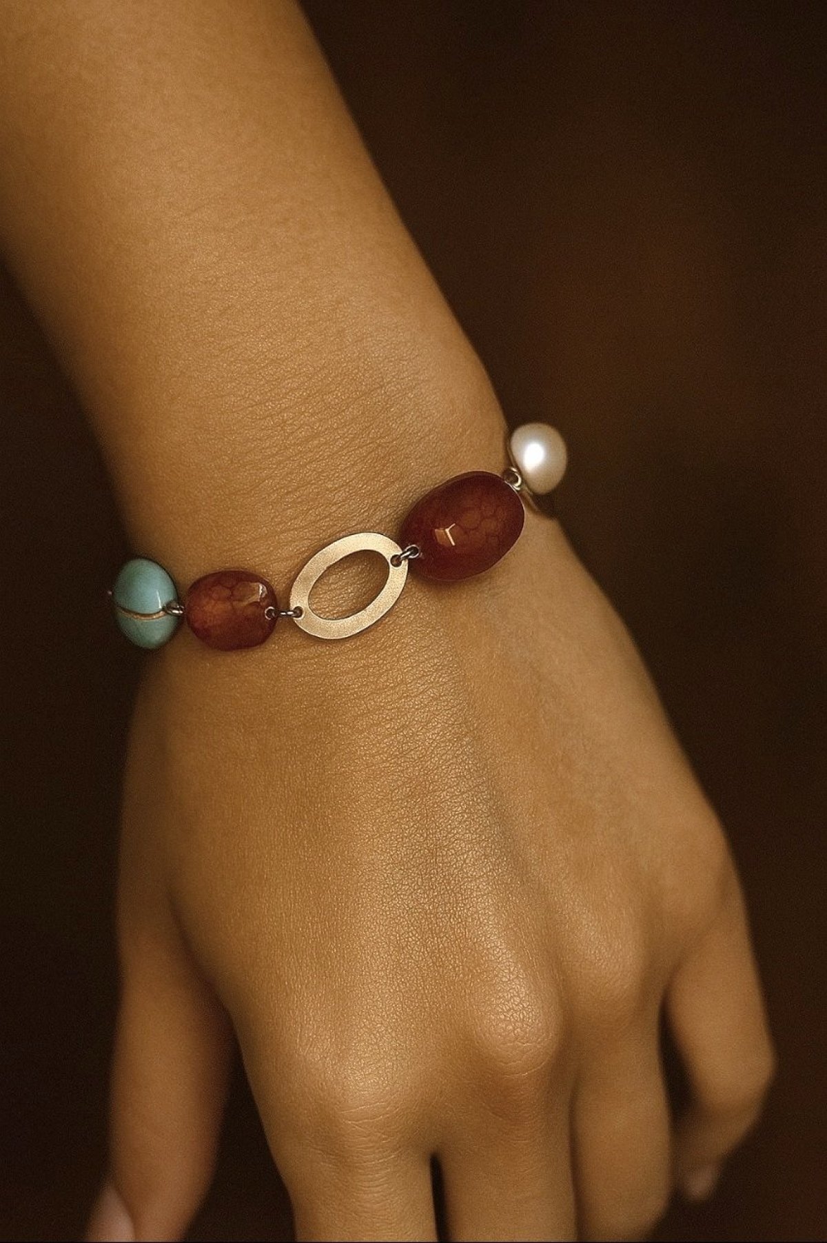 Silver bracelet inlaid with agate, turquoise, and natural pearls