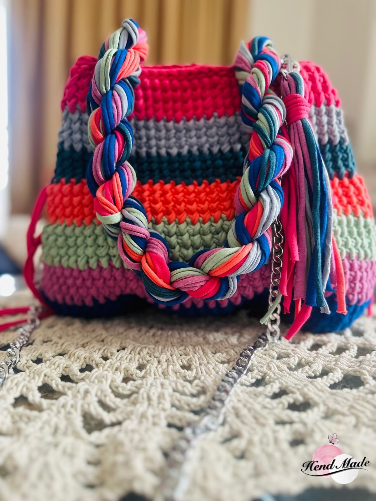 Modern colorful kilim thread bag with a short colorful handle size 20cm and a long metal handle size 50cm .