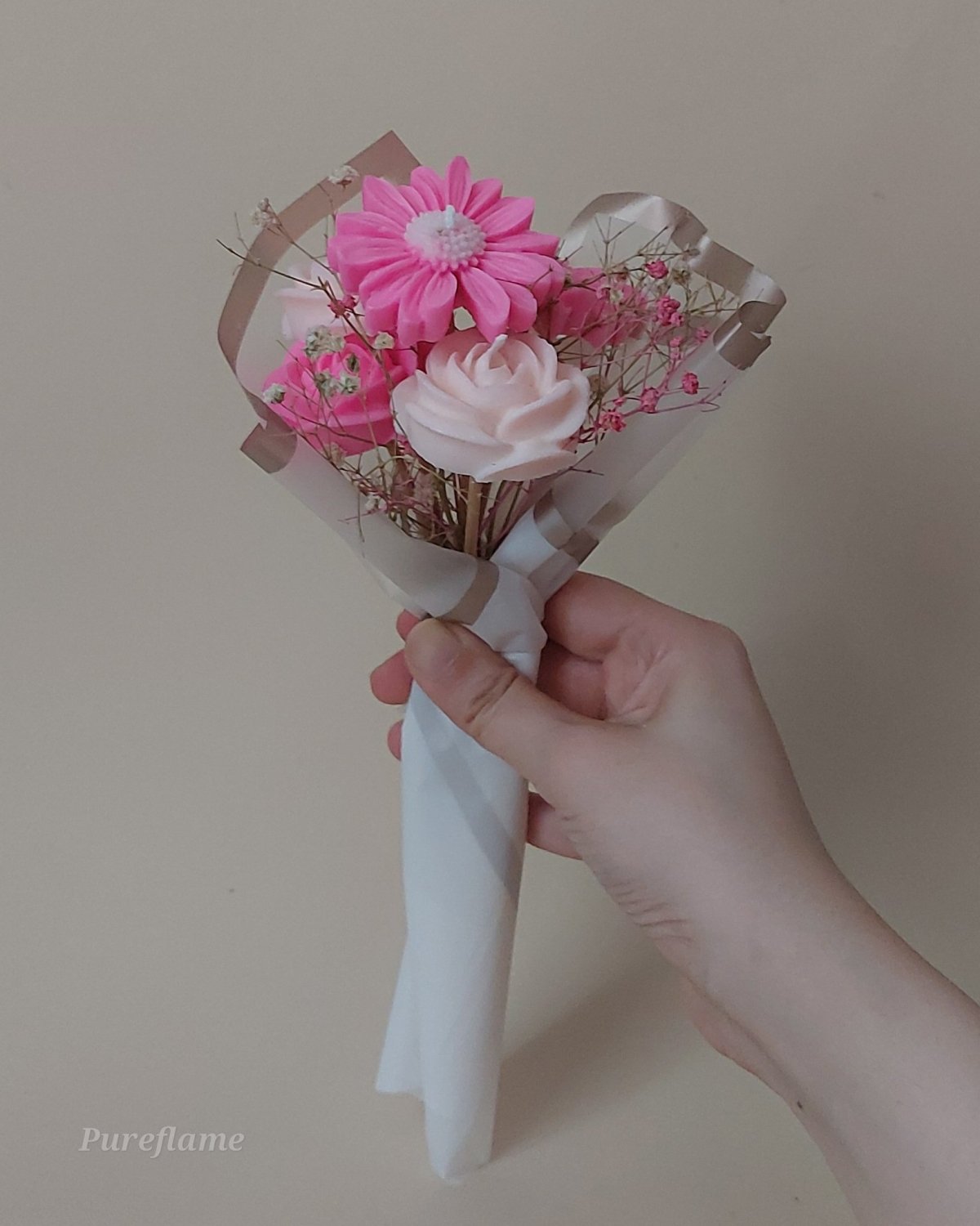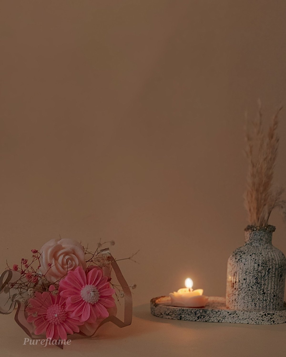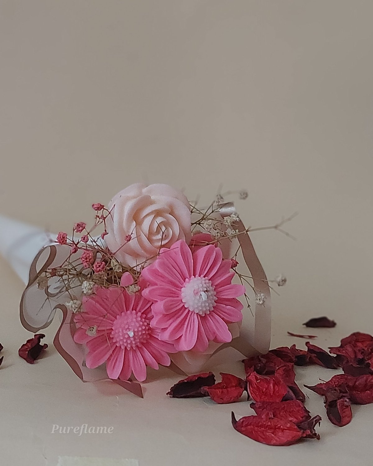 Handcrafted Scented Wax Flower Bouquet A beautiful bouquet made of 5 handmade wax roses, delicately scented with a long-lasting aroma. The bouquet also includes decorative artificial flowers for an elegant finishing touch. Perfect as a thoughtful gift or a charming piece of decor that brings warmth and serenity.