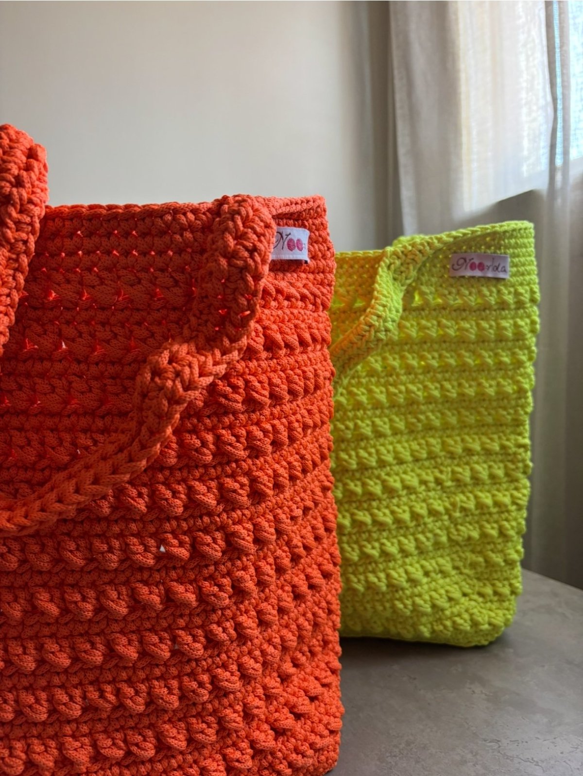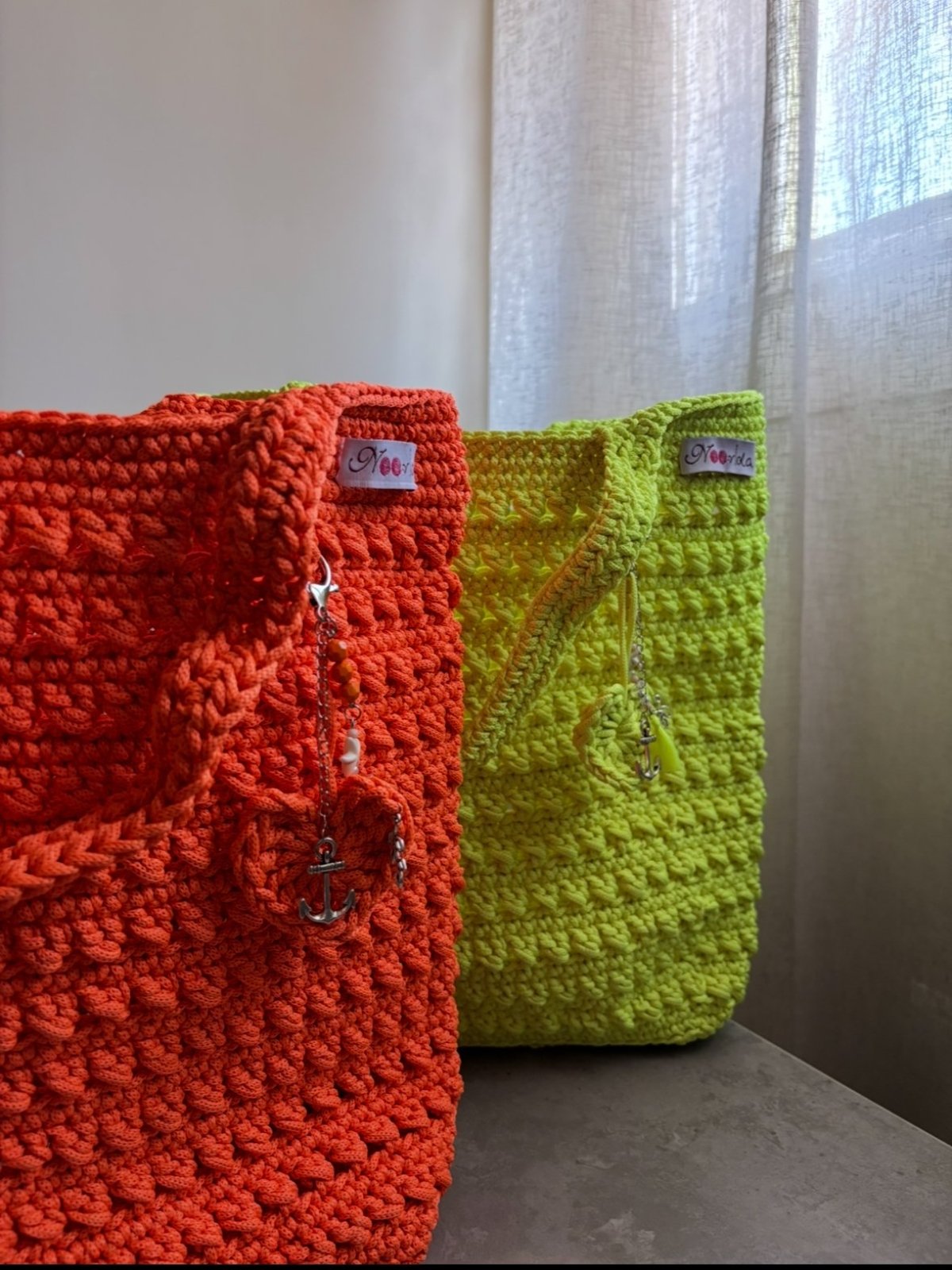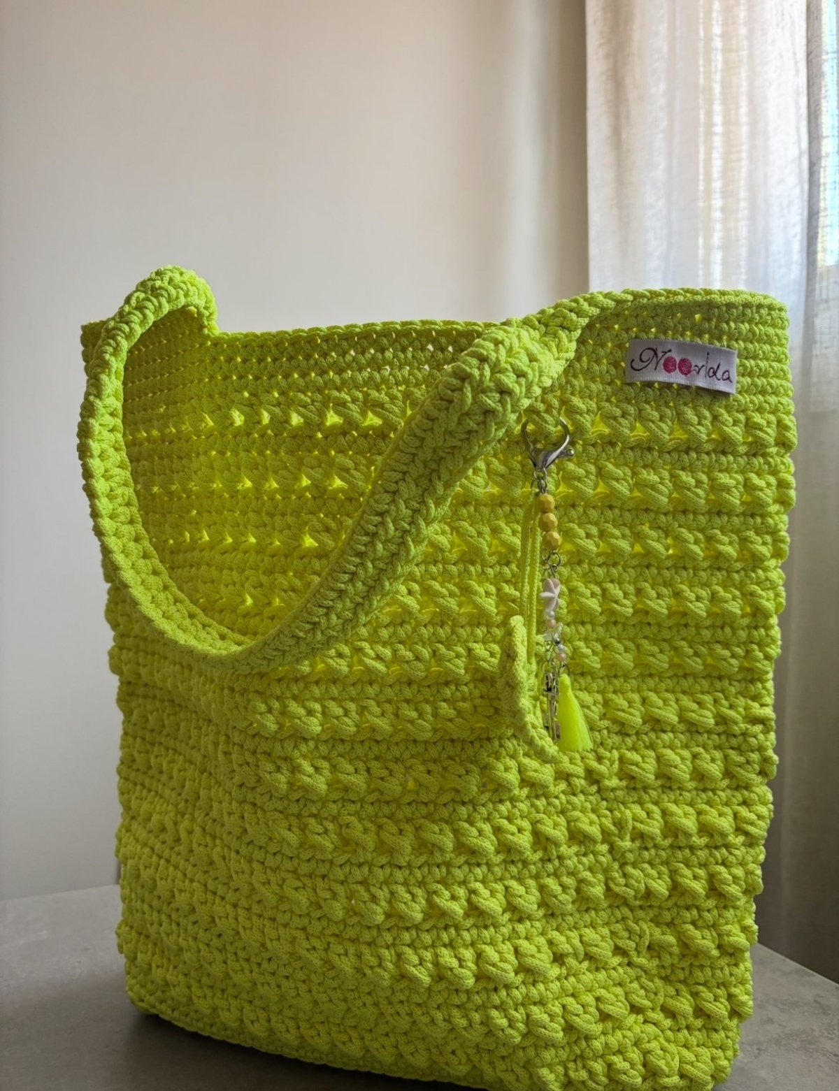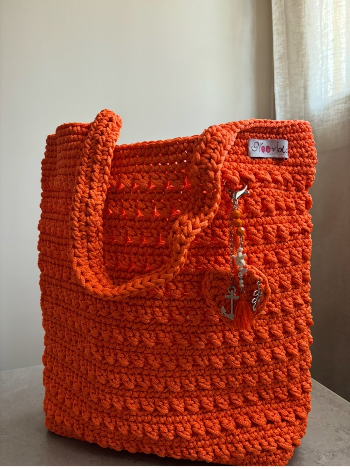 Big Beach bag Made from Egyptian light yarn Big size to fit all your essentials Comes with a small bag charm Colour: orange / yellow Immediate purchase only one available from each color Size : 37 cm x 33 cm
