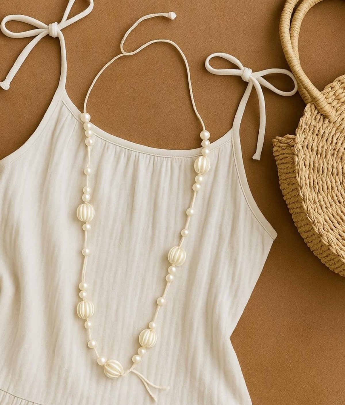 A long handcrafted necklace combining glossy pearl-like beads with unique thread-wrapped accents. Lightweight and elegant, perfect for summer outfits and beachside charm.