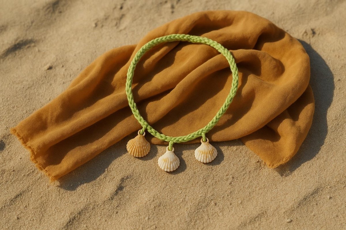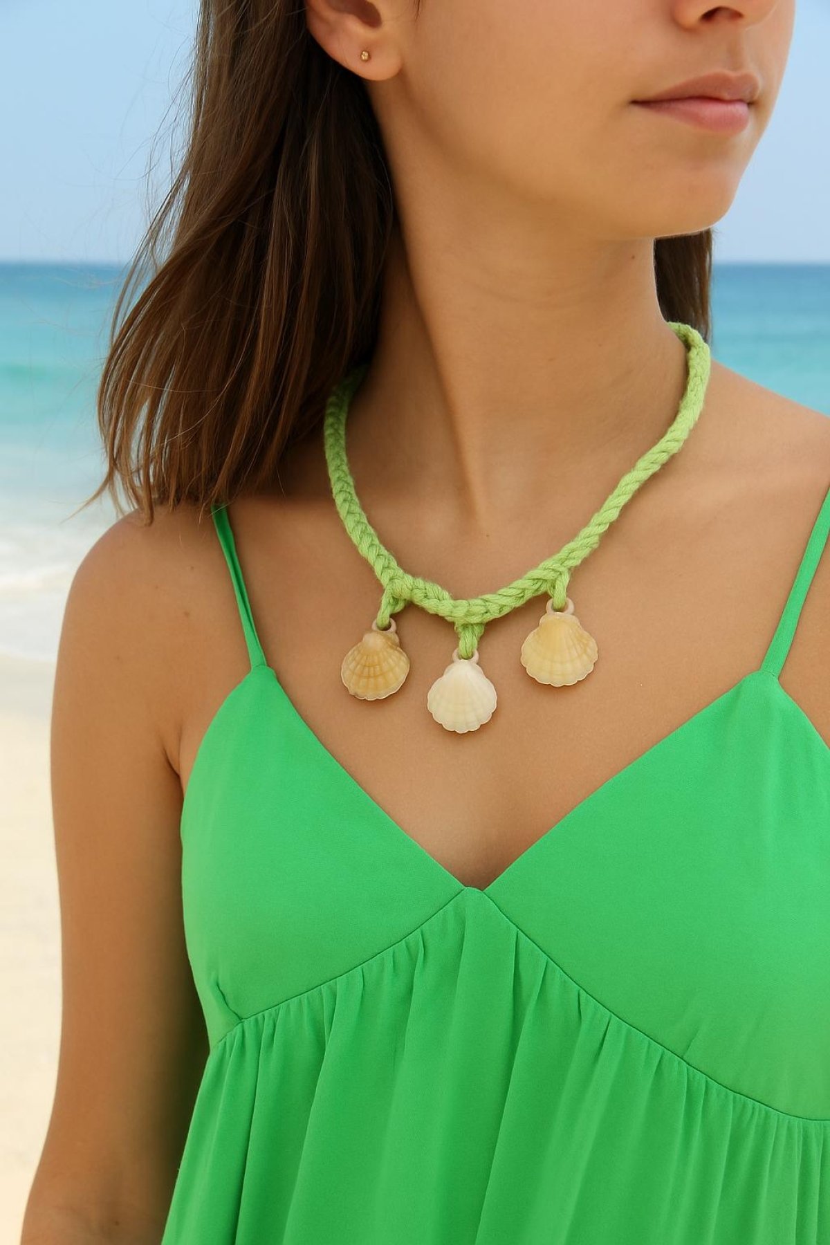 Description: Summer green braided cord necklace adorned with three natural seashells for a chic seaside look.