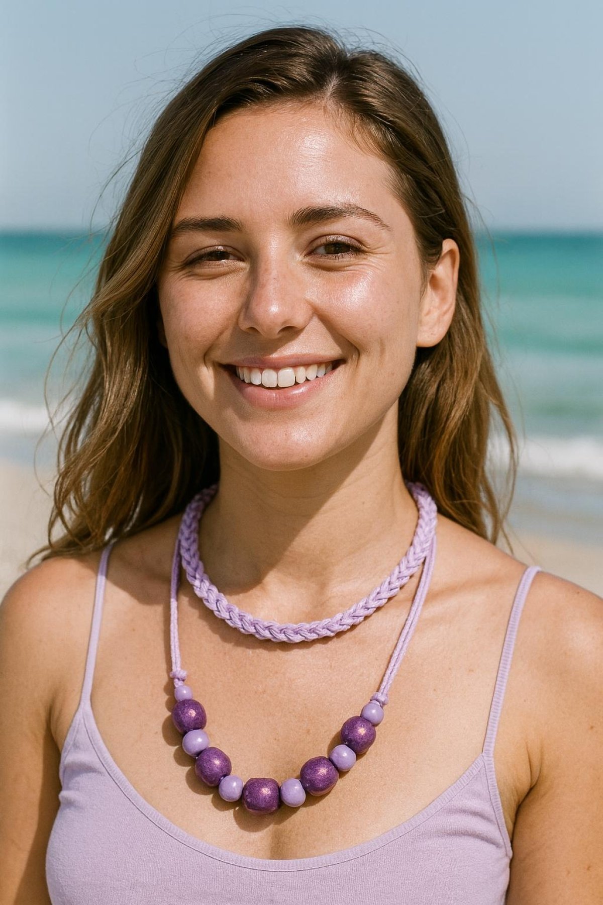 Handmade braided cord necklace with large and small purple beads, combining elegance and a vibrant beach-inspired charm.