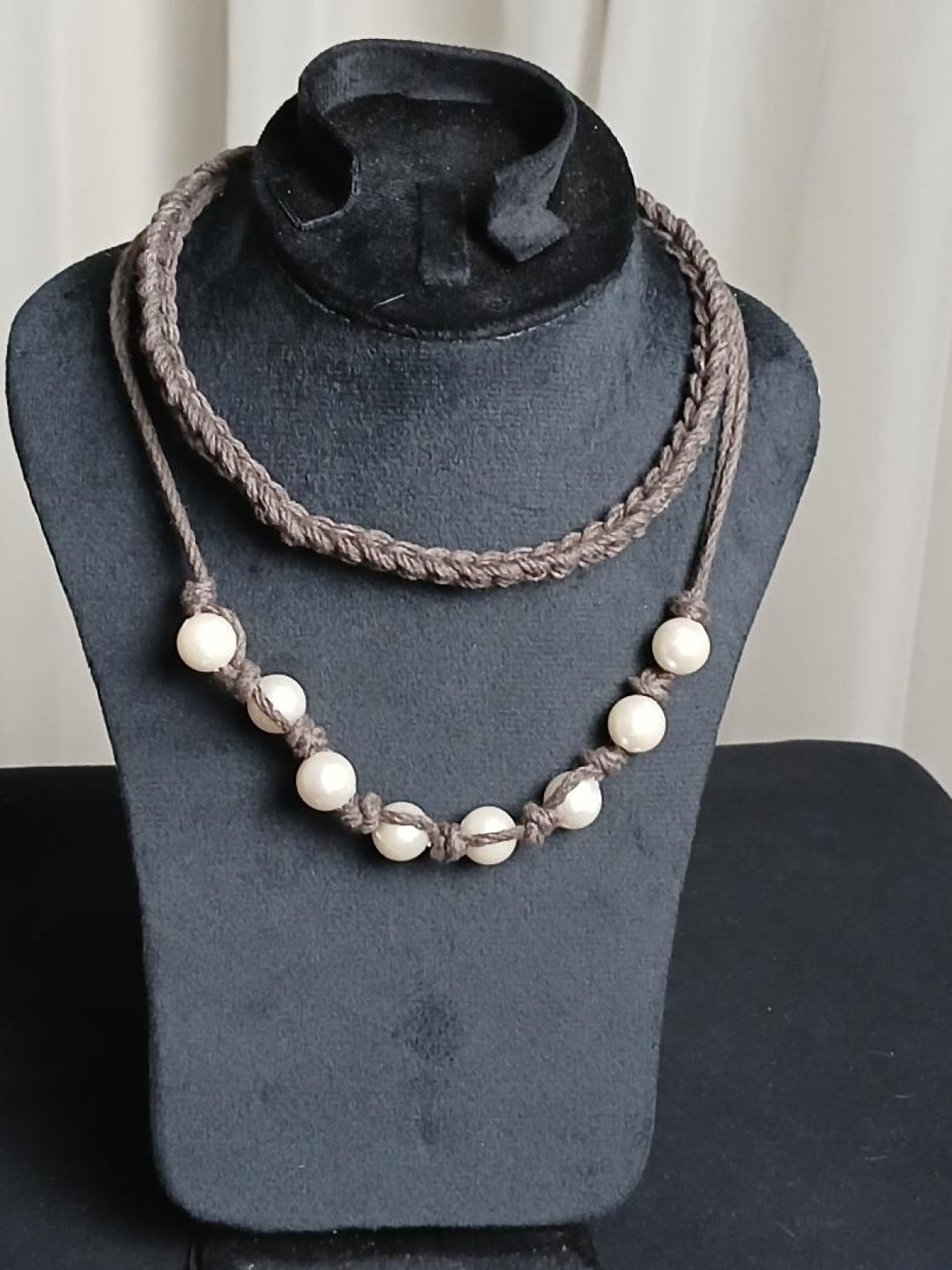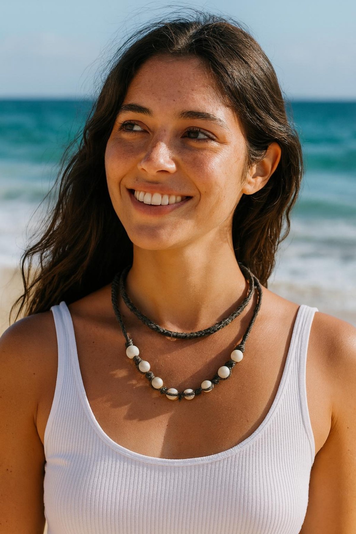 Handcrafted brown cord necklace with smooth ivory beads, perfect for a natural, beach-inspired look.