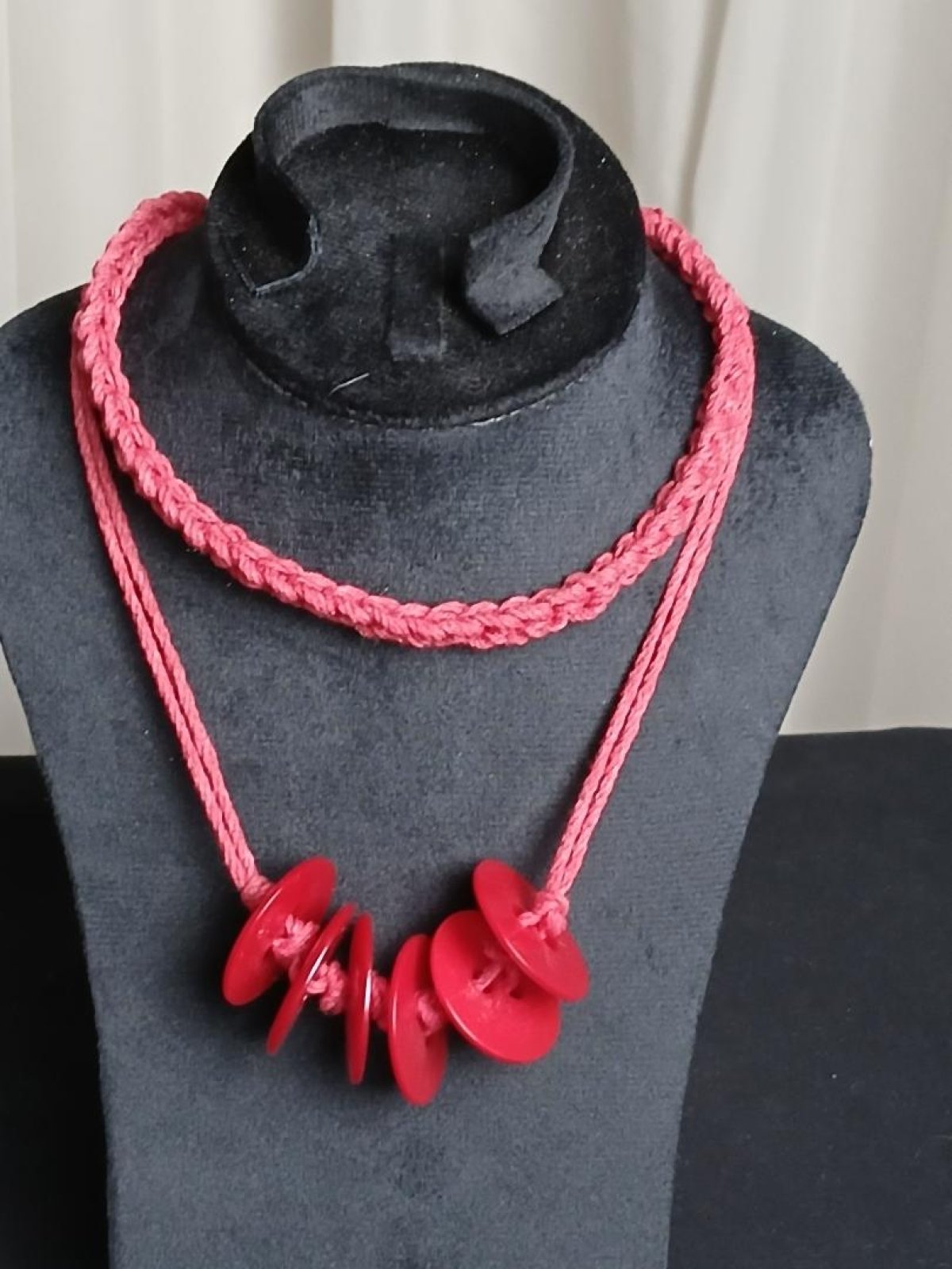 Handcrafted coral crochet necklace with bold red flat discs, designed for a vibrant beach-inspired look