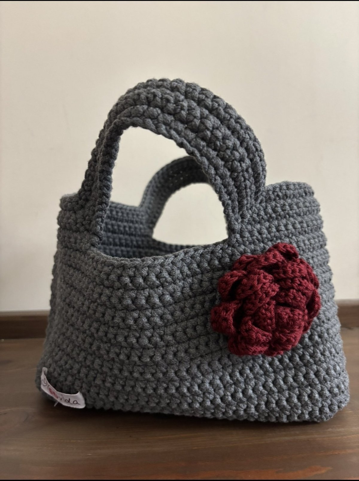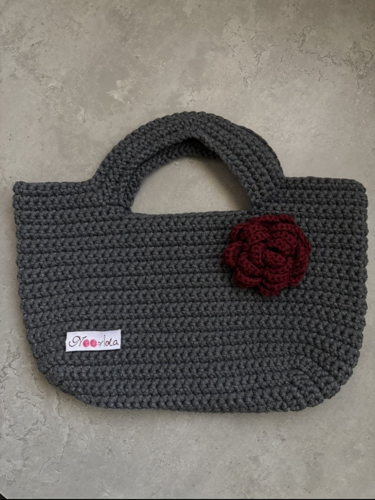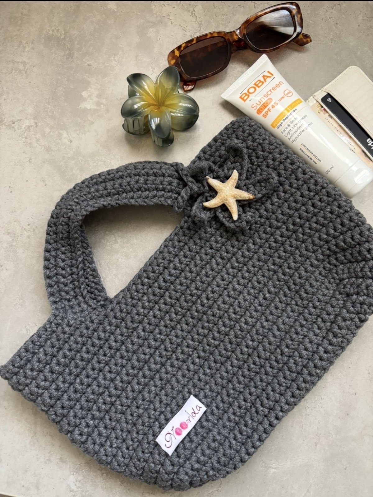 Beach bag Made from Egyptian cotton yarn Small size for your essentials on the beach Comes with a star bag charm and a flower brooch Available in dark grey color Immediate purchase Size : 33 cm x 14 cm