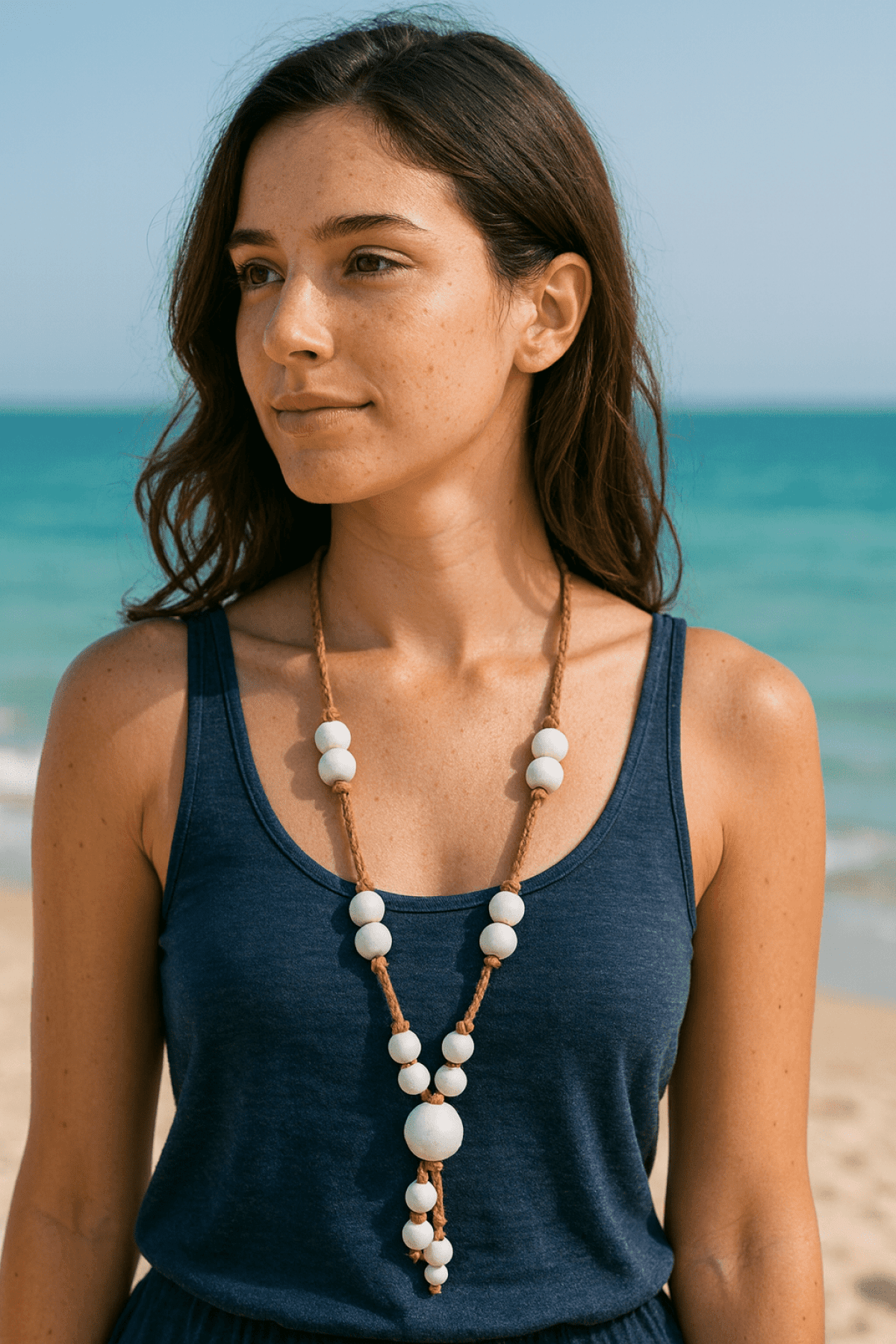 A handcrafted long necklace featuring smooth white wooden beads on a natural brown cord, designed for a relaxed beach-inspired look.