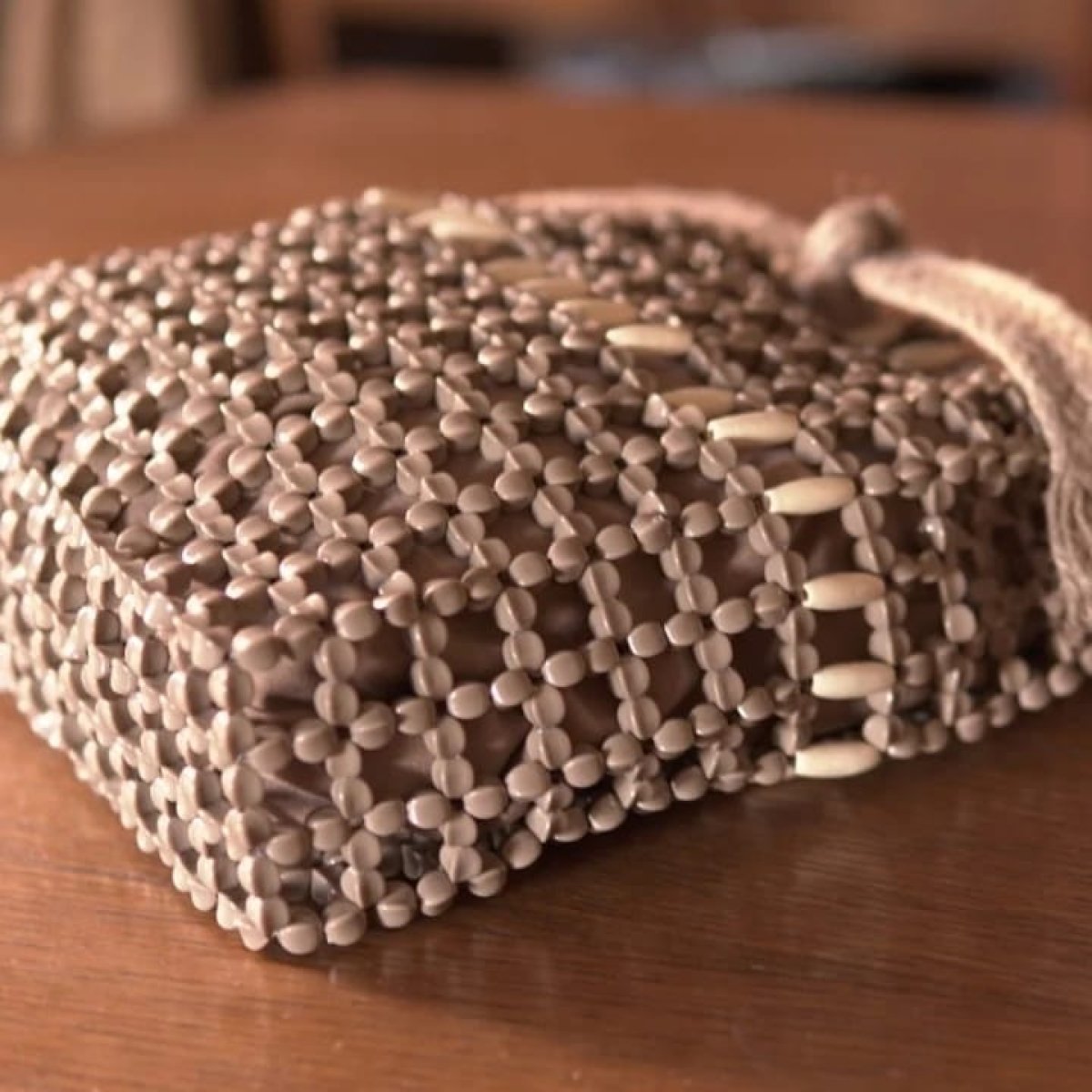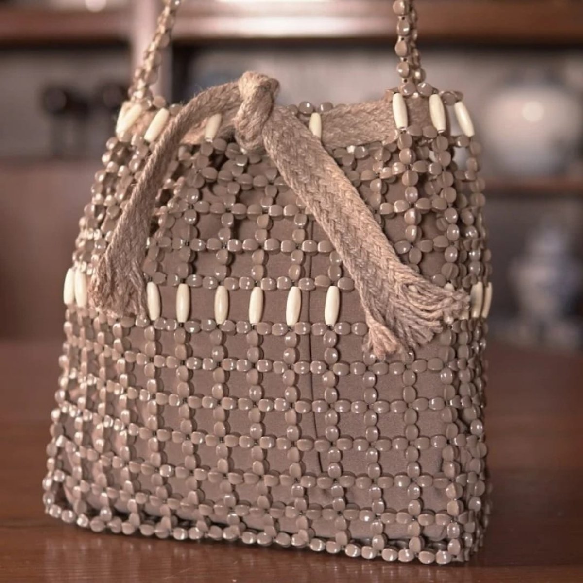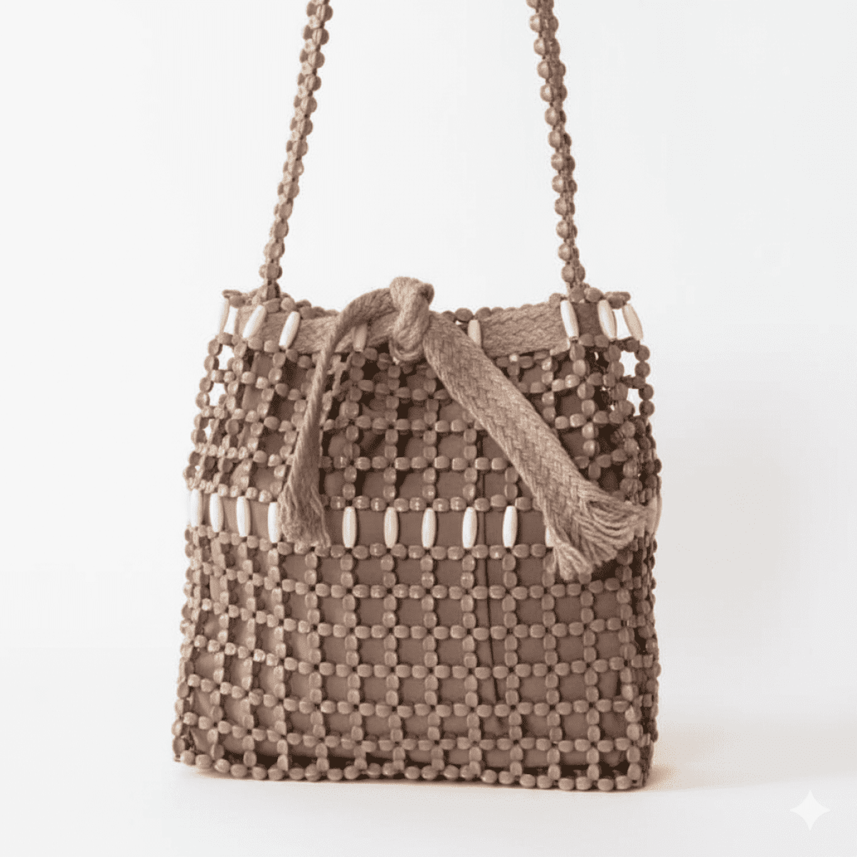 Camel-colored beads with white wood, with a removable lining. Length: 30 cm Width: 26 cm