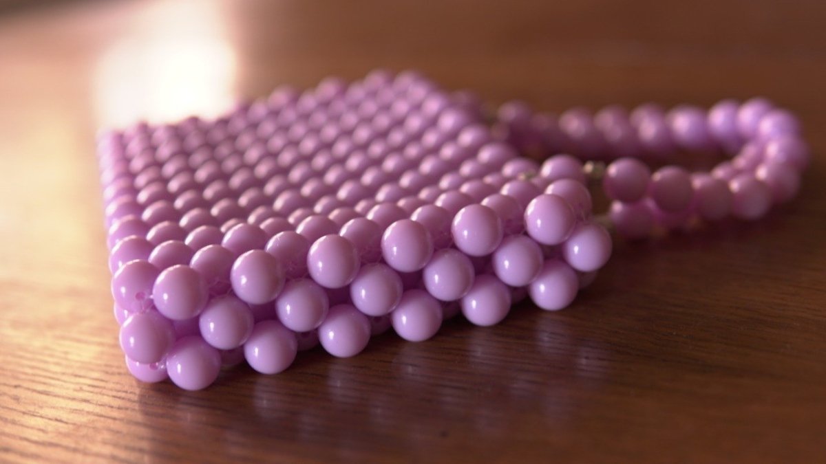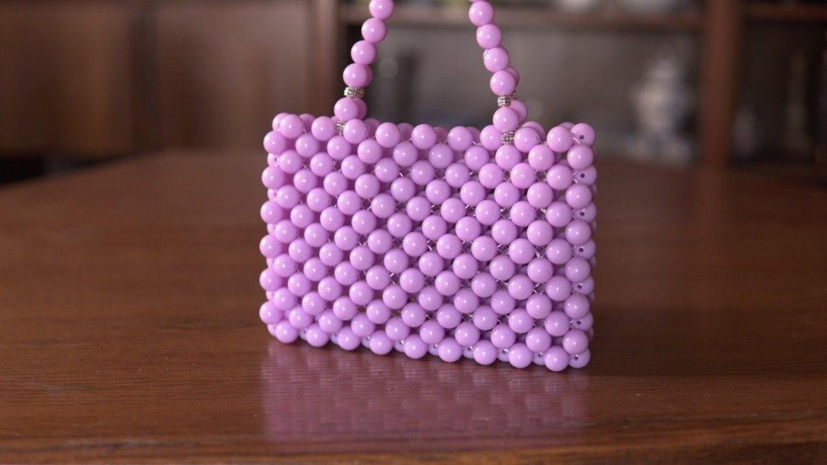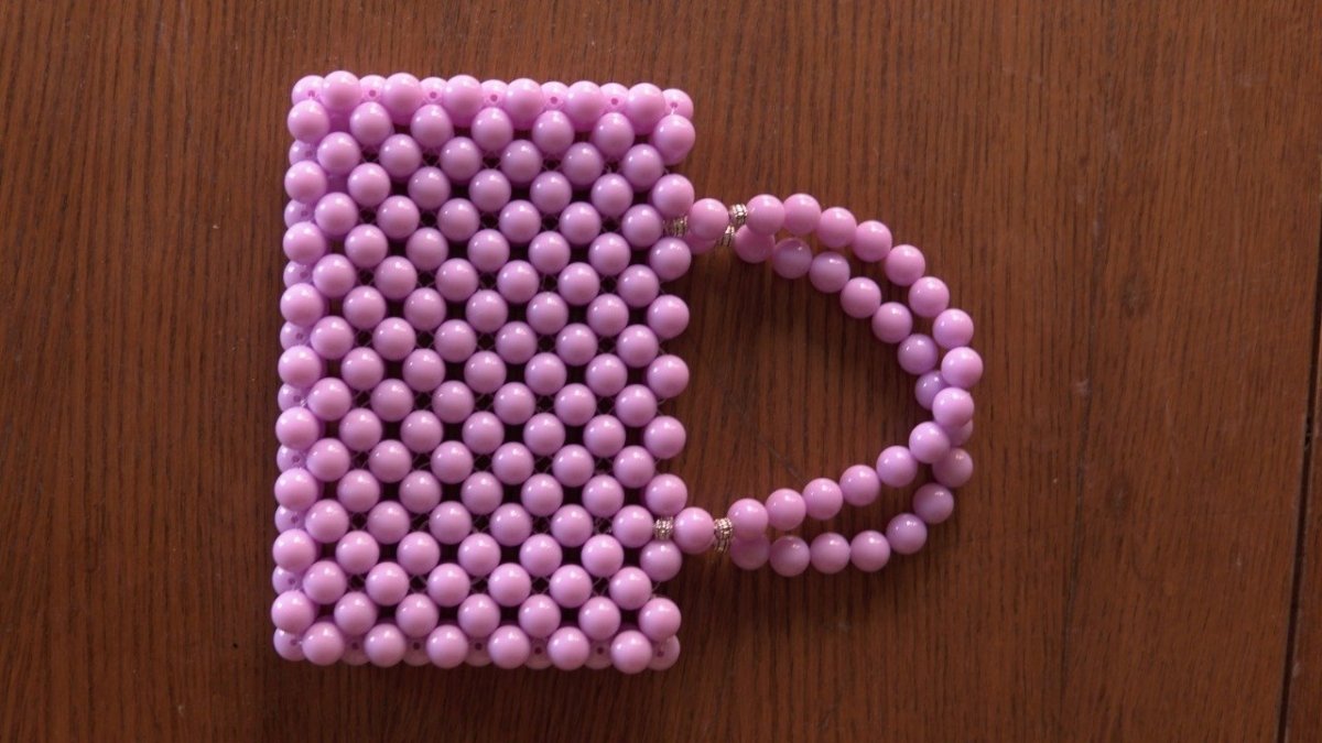 Purple beaded bag with large beads Height: 15 cm Width: 22 cm Small handle
