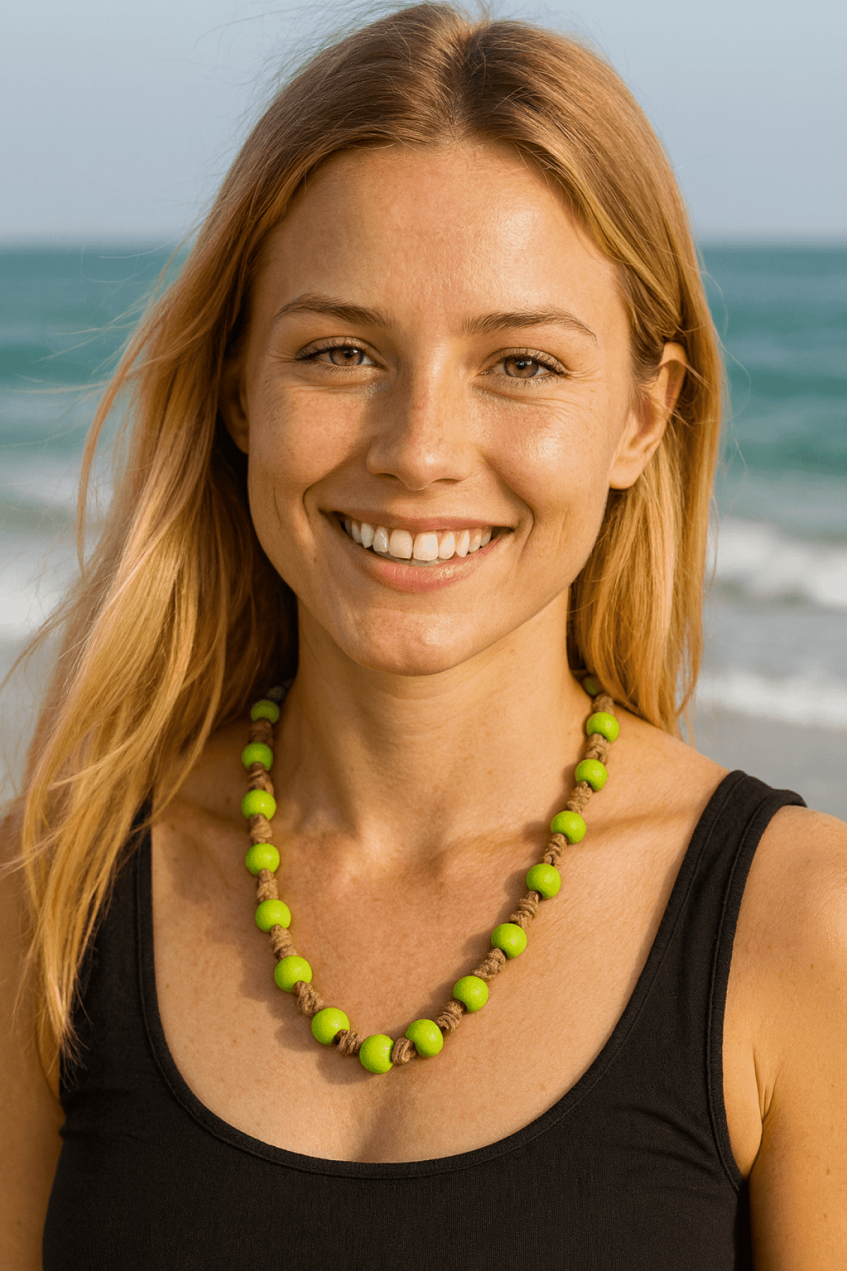 A handcrafted necklace featuring glossy lime-green wooden beads, carefully knotted with natural brown cord. The earthy thread and vibrant beads create a fresh, bohemian-inspired accessory perfect for beach days or casual summer outfits.