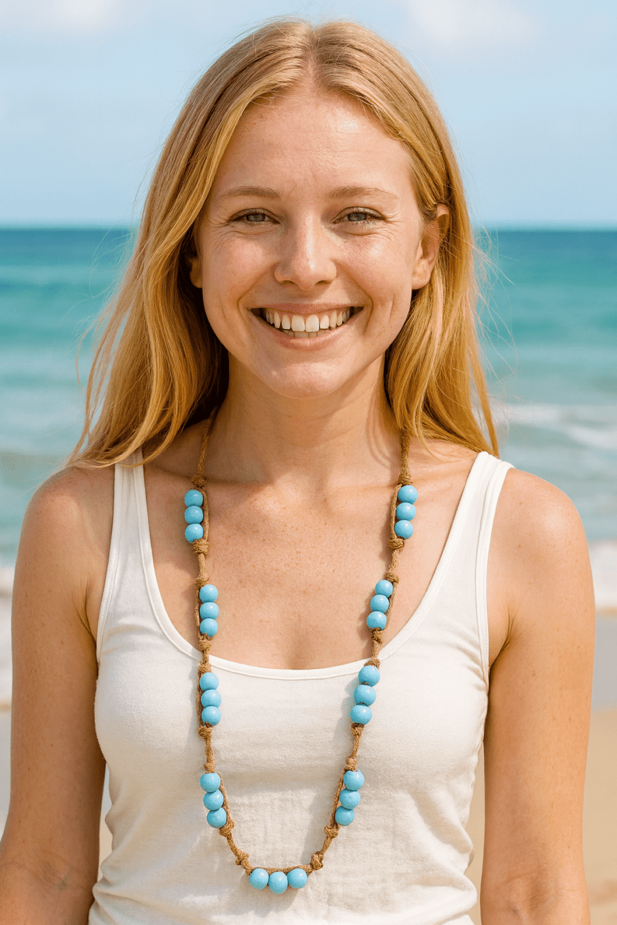 A handmade bohemian necklace featuring sky-blue wooden beads strung on natural brown rope with hand-tied knots. Its earthy texture and fresh ocean-inspired color make it the perfect accessory for beach days and summer outfits.