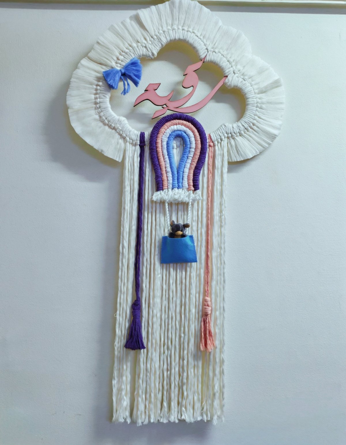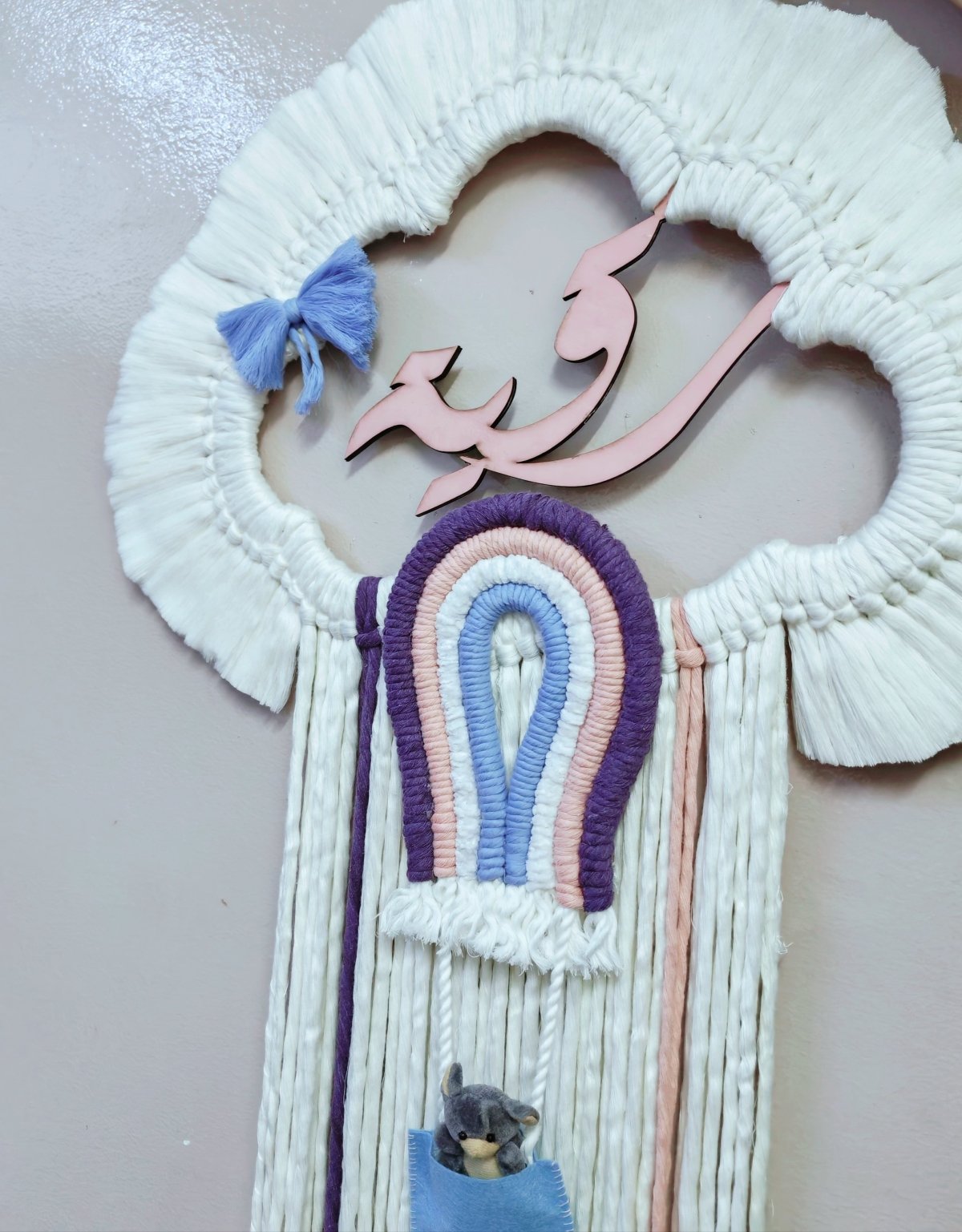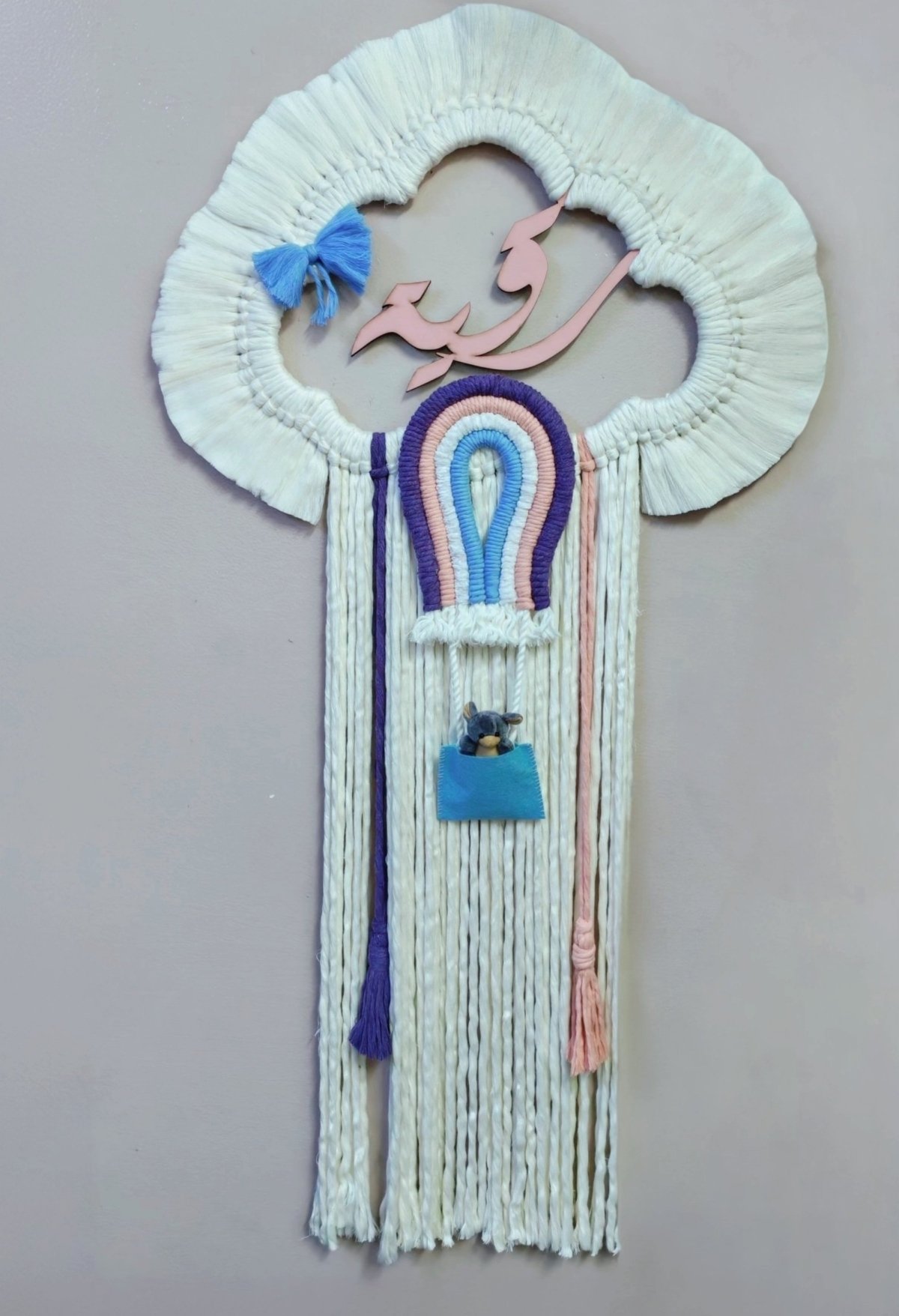 Cloud macrame wall hanging decore by specific name Made of cotton macrame threads Size Wooden size 40 cm total width 50 cm , Total length 130 cm Can change size, name and colour by ordered