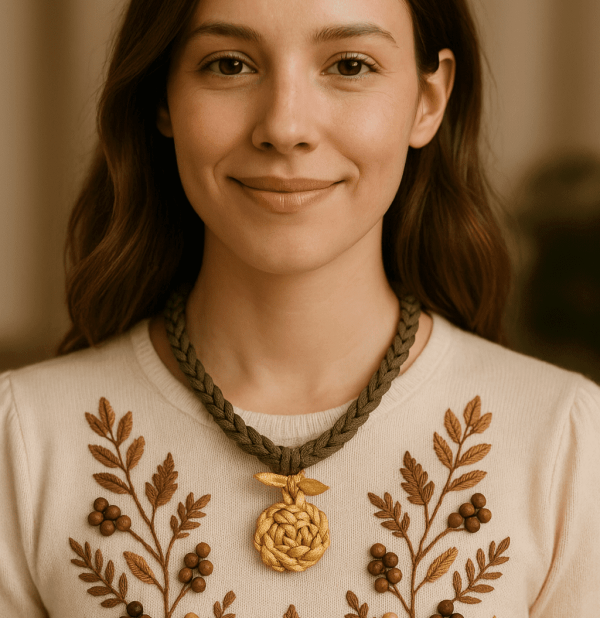 A handcrafted olive-green braided necklace featuring a medium-sized golden rose pendant. The unique floral centerpiece adds a bold yet elegant touch, making it a perfect statement accessory for autumn outfits and special occasions.