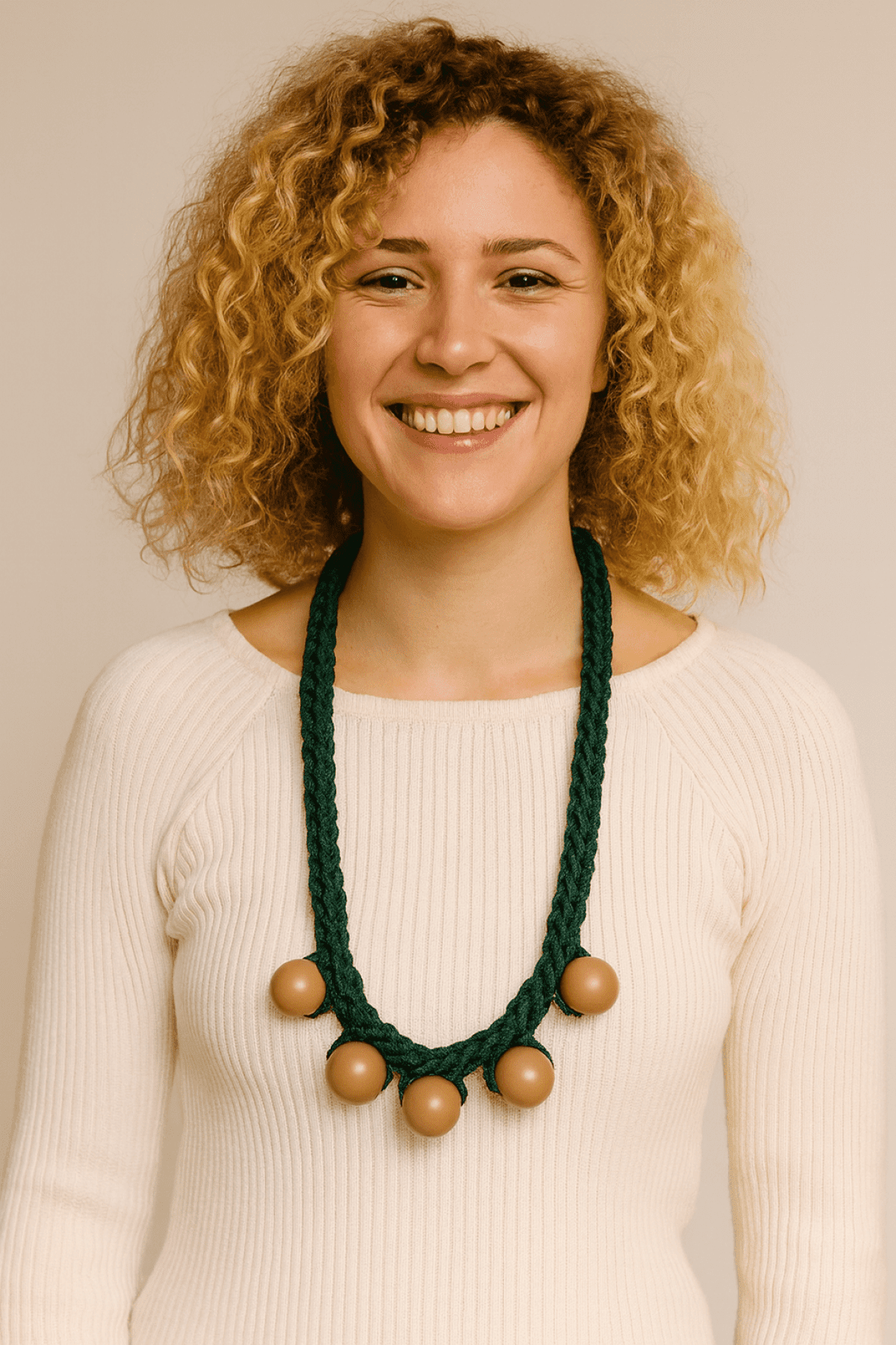 A handcrafted statement necklace made of deep green crochet rope, adorned with five large round wooden beads. The bold yet natural design blends rustic charm with modern elegance, making it a unique accessory for autumn outfits. Perfect for adding a touch of earthy sophistication to casual or chic looks.