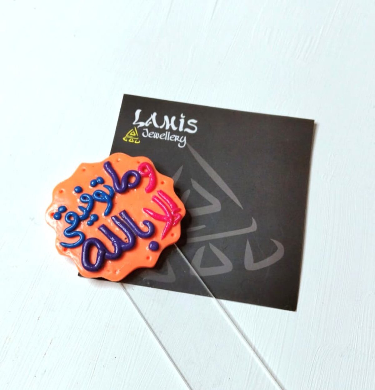 A handmade polymer clay bookmark, featuring a yellow circular design decorated with the Arabic phrase “Subhan Allah” in vibrant blue and red colors, surrounded by colorful dotted patterns. A unique piece that adds a spiritual and artistic touch to your books