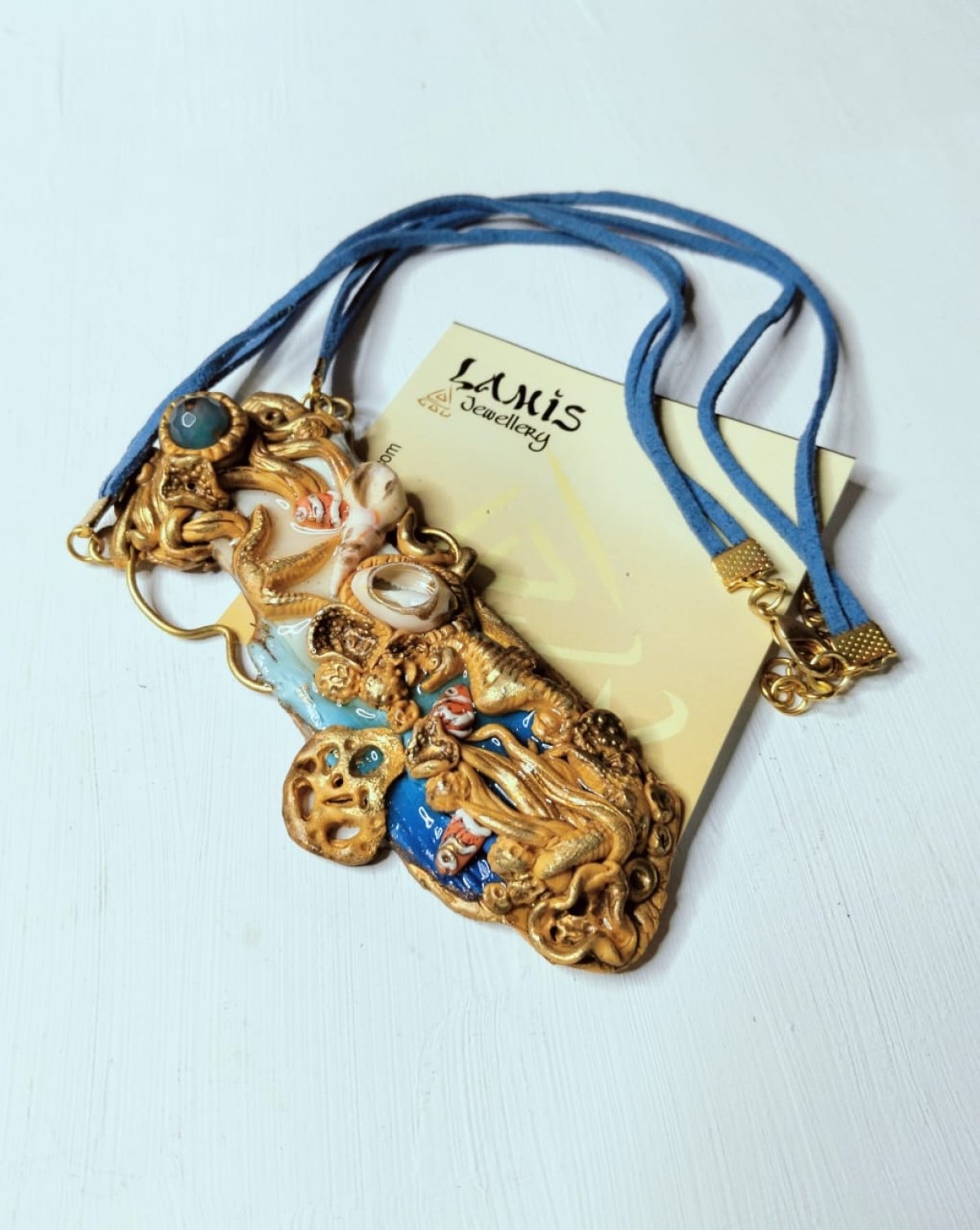 A clay neck medallion inlaid with leather, handcrafted with love.
