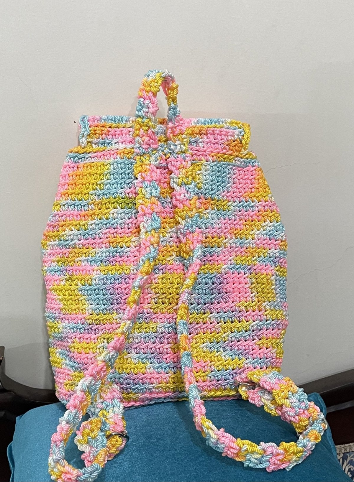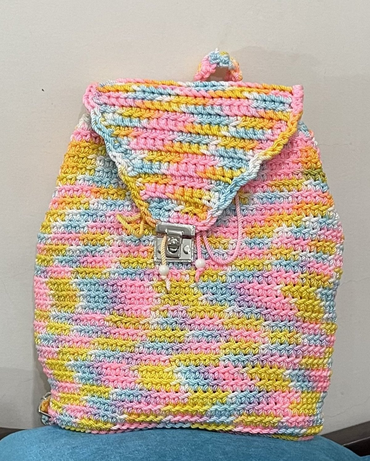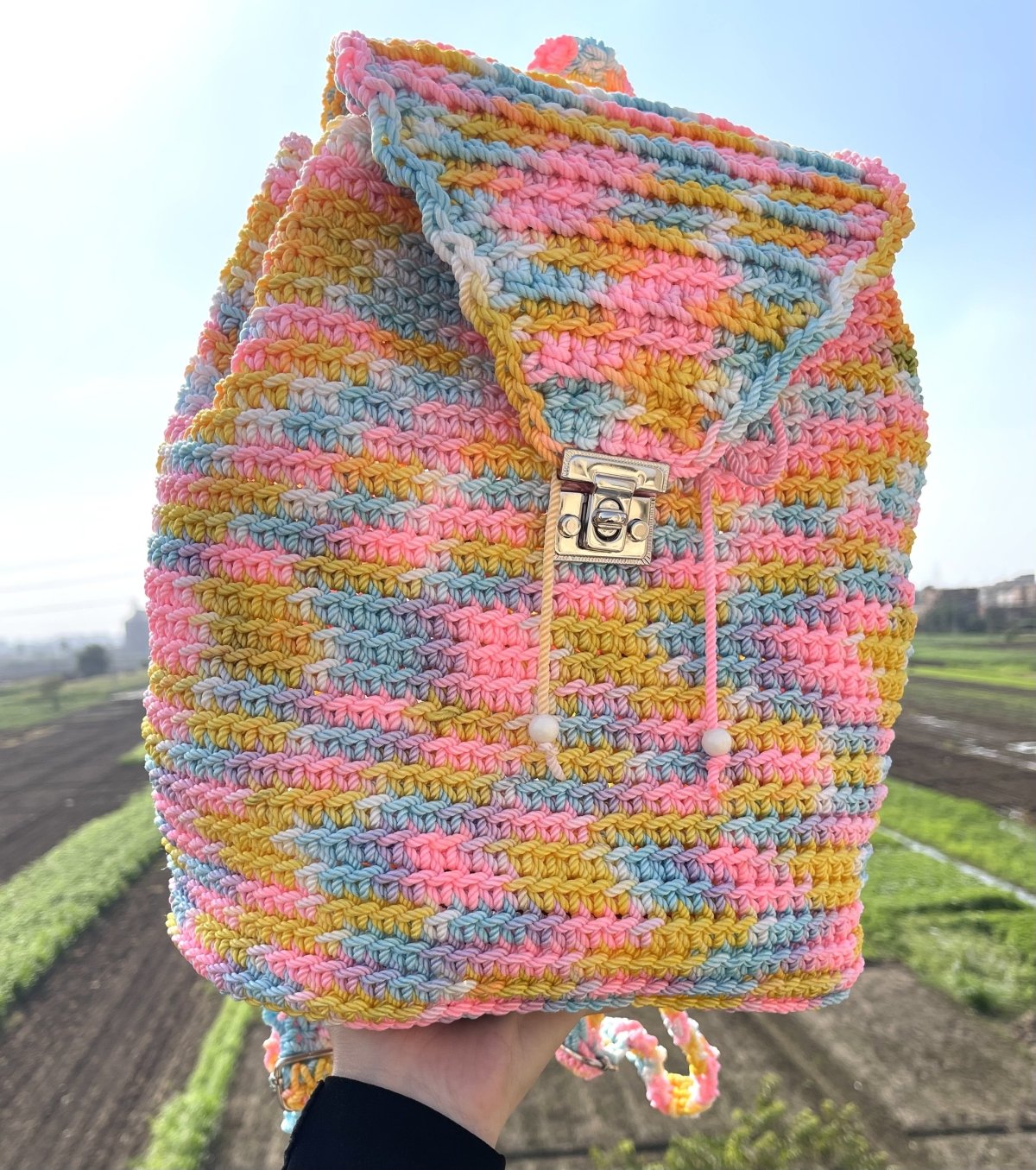 Multi-colored backpack made of high-quality Egyptian macrame thread, equipped with metal rings to control the length of the strap, a metal lock for closure, and a reinforced base. The bag is characterized by its durability and is washable in cold water. Length: 33 cm, Width: 33 cm, Base length: 28 cm, Base width: 16 cm