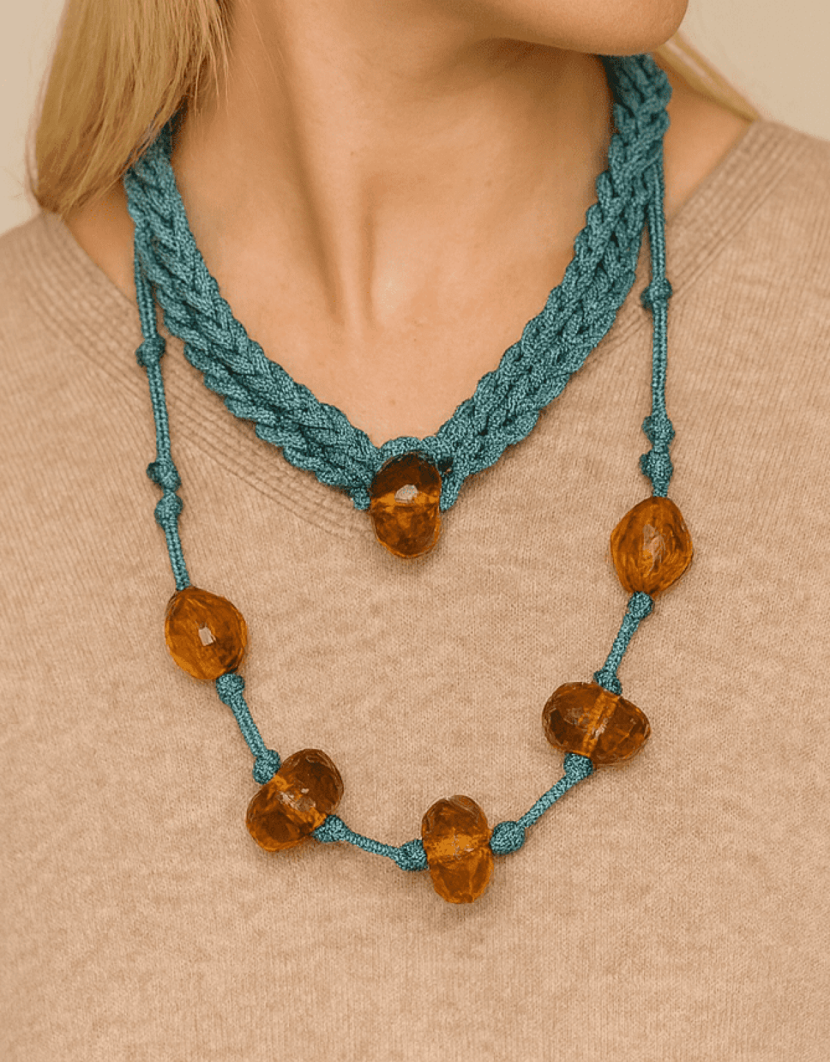 A statement handmade necklace featuring a thick braided teal rope adorned with large faceted amber-colored crystal beads. The design combines a bold, earthy elegance with a touch of bohemian style, making it perfect for both casual and evening wear.