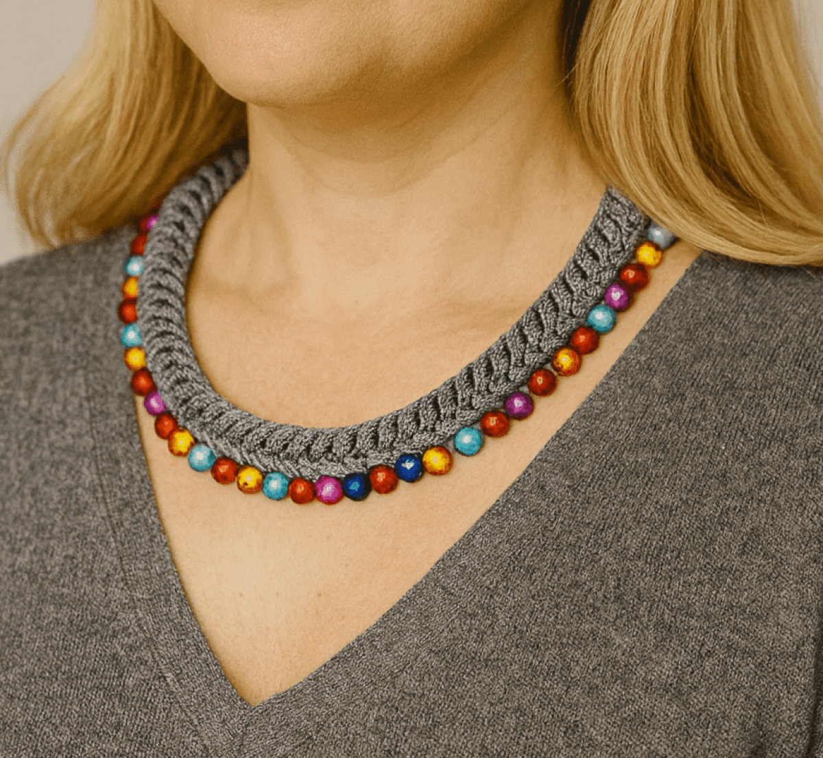 A handmade crochet necklace crafted from thick gray yarn with a braided texture. Along the outer edge, it features a row of glossy, round beads in vibrant colors — including orange, turquoise, fuchsia, red, and yellow — creating a cheerful contrast against the neutral gray base. The necklace sits beautifully along the neckline, making it a standout accessory for casual and chic outfits alike.