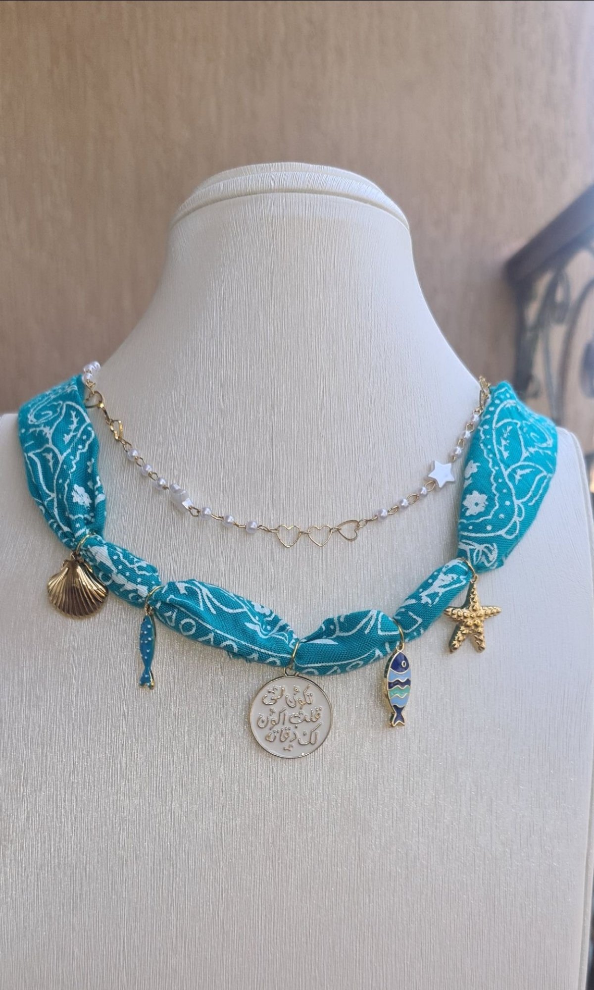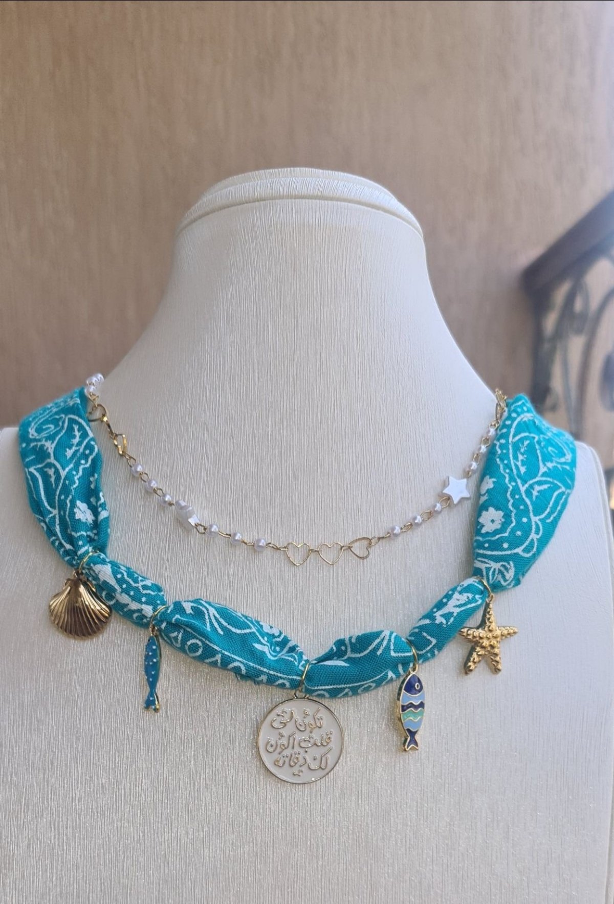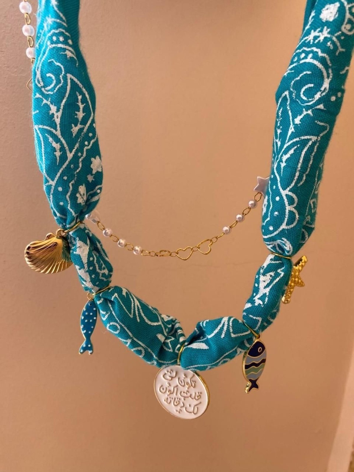 A necklace made of two layers: A layer made of a bandana in various colors (the color of the bandana can be chosen as desired) with a group of charms added to it (which can be changed as desired). The second layer is a Chinese gold necklace.