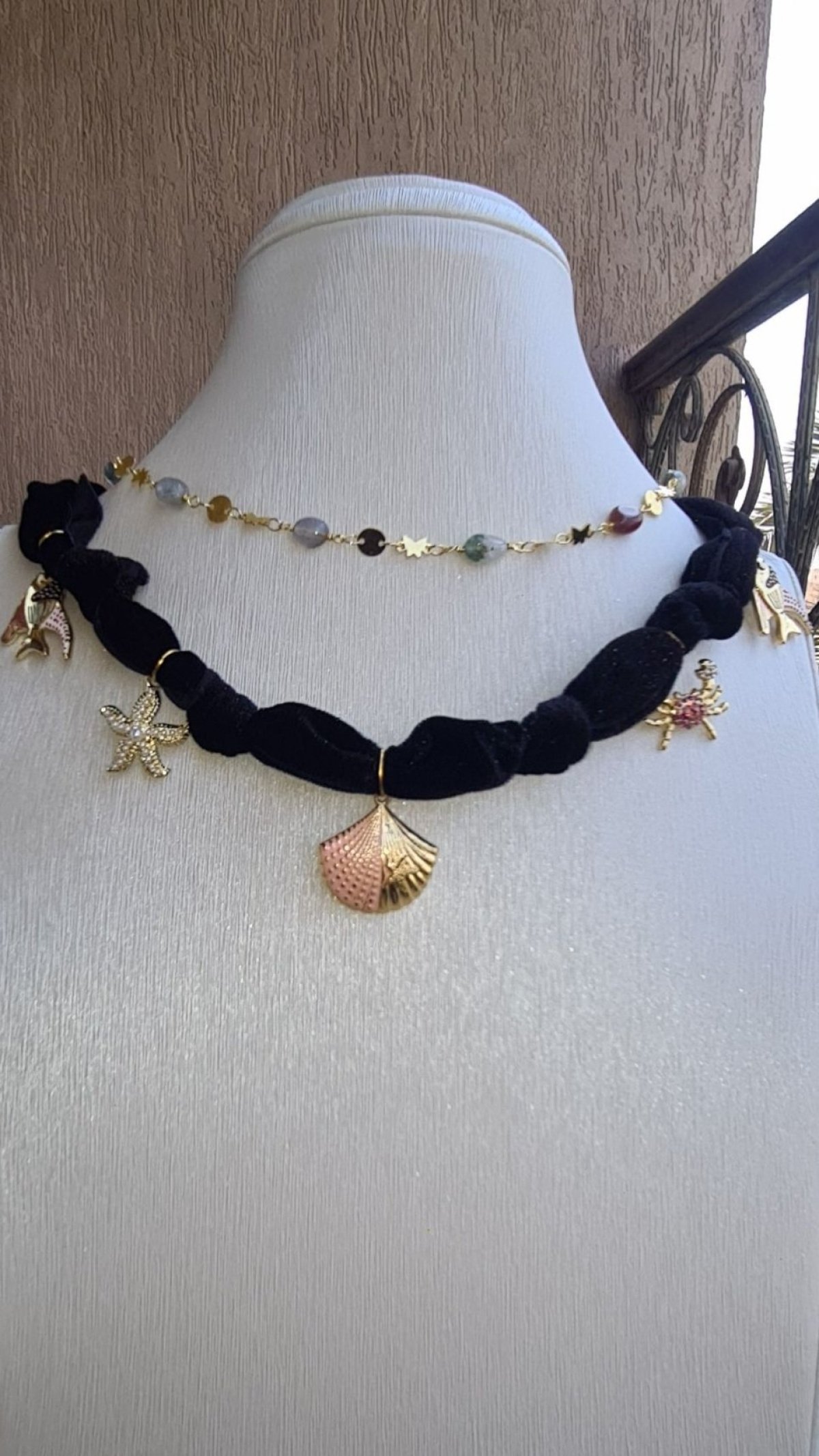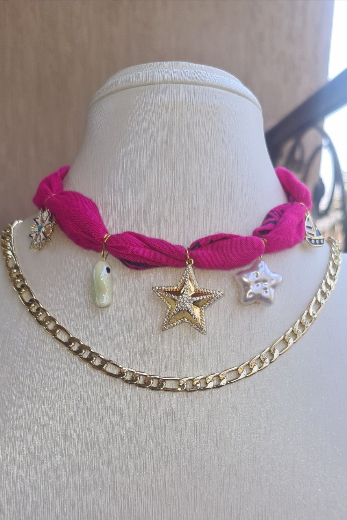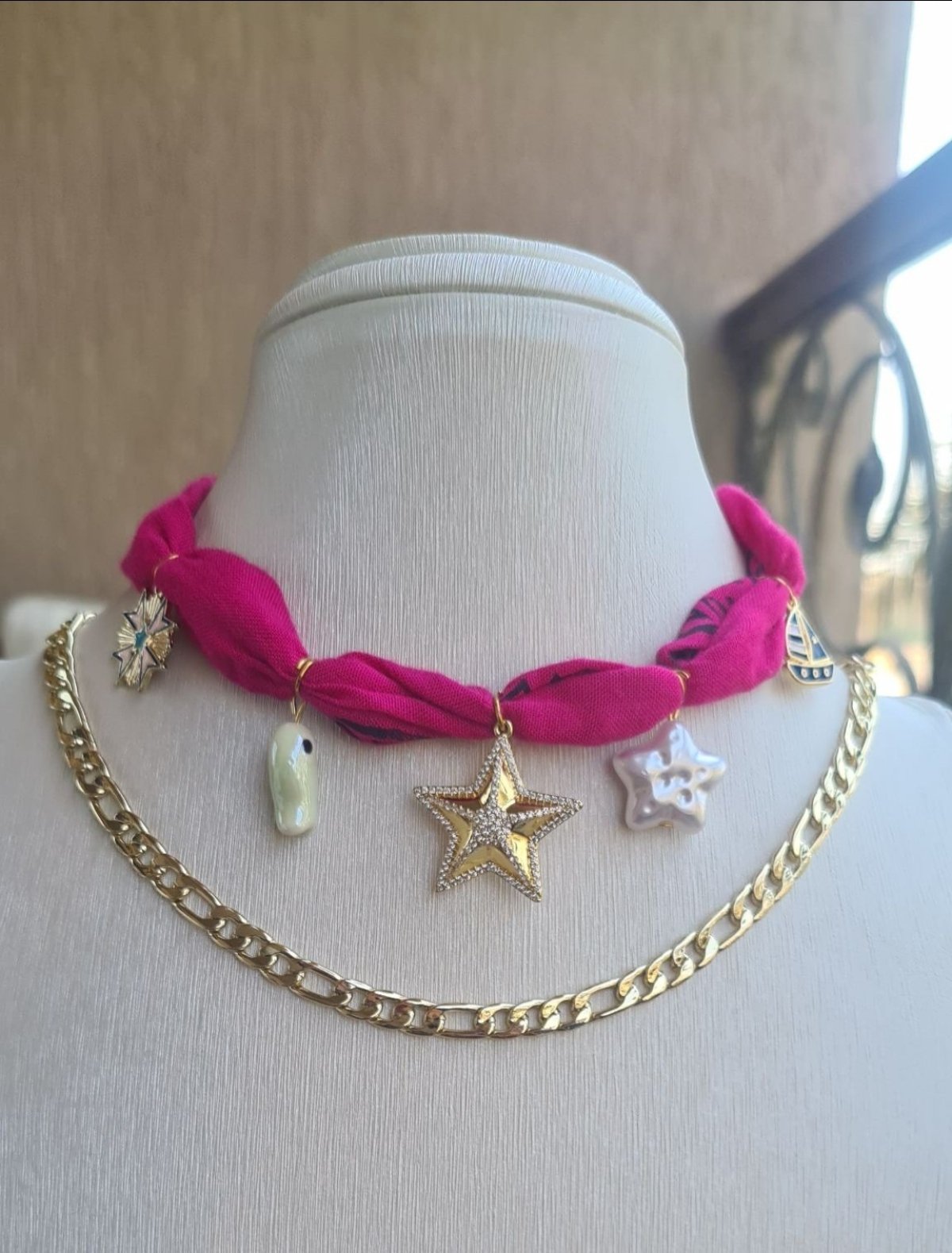 A necklace made of two layers: A layer made of a bandana in various colors (the color of the bandana can be chosen as desired) with a group of charms added to it (which can be changed as desired). The second layer is a Chinese gold necklace.