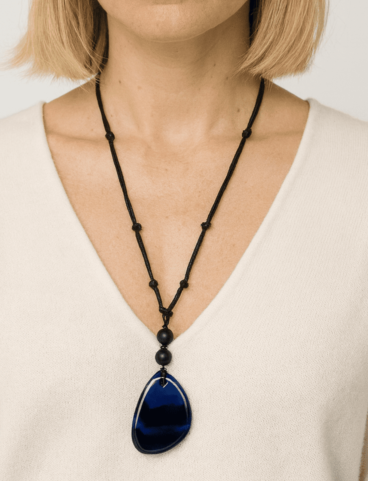 An elegant handcrafted necklace featuring a deep midnight-blue teardrop stone pendant, suspended from a black braided cord adorned with matte black beads. The minimalist design, paired with the smooth off-white knit background, highlights the pendant’s glossy finish and refined simplicity — perfect for a timeless, effortlessly chic look.