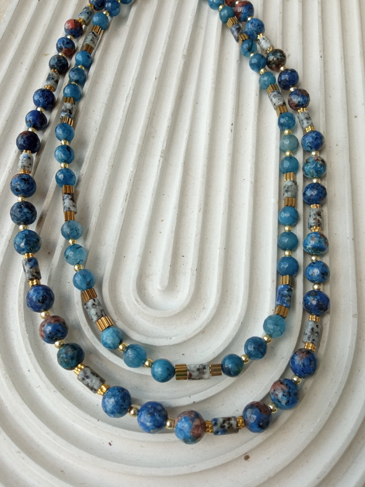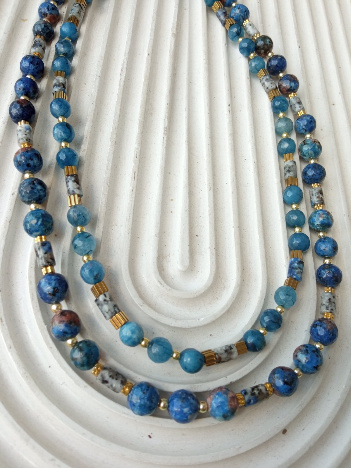 A handcrafted necklace featuring a deep blue agate centerpiece, framed by delicate gold spacers inspired by Chinese lattice. Interspersed hematite accents add a subtle, metallic sheen, echoing twilight reflections. The strand is finished with elegant gold-toned chain links and a secure clasp, creating a versatile piece that transitions from day to night with timeless, artisanal charm.