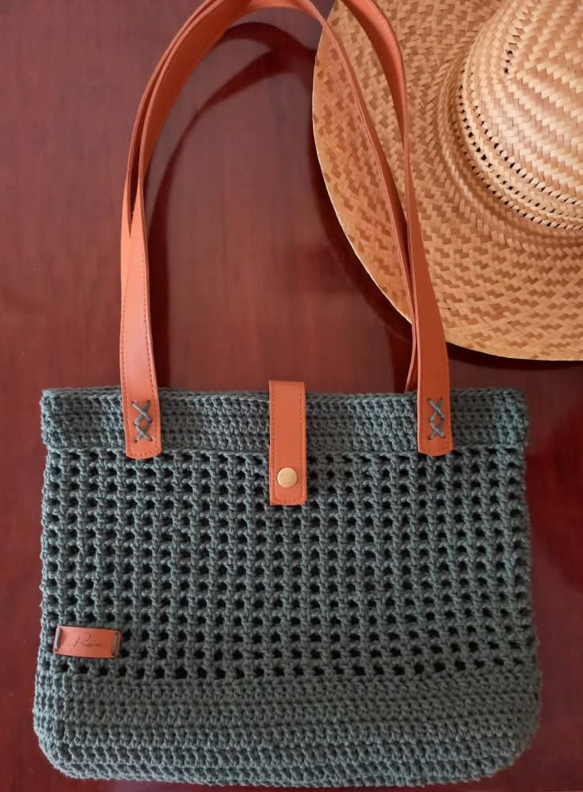 Crochet mesh bag with leather straps Length 28 Width 36 Strap length 80 cm Cotton macrame yarn Green color