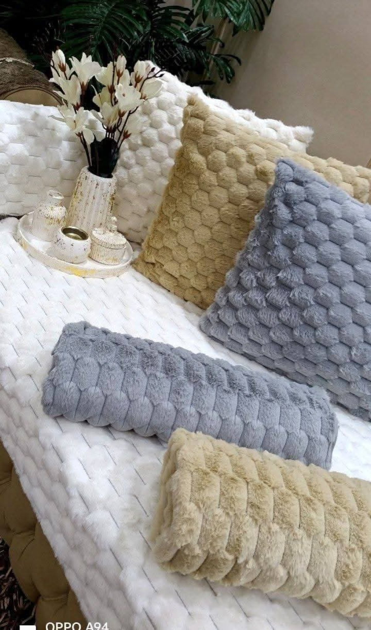 Faux fur bubble cushion, 45cm x 45cm Extremely soft, perfect as a decorative piece for a bedroom bed or living room. Available in off-white, beige, gray, cashmere, and white.
