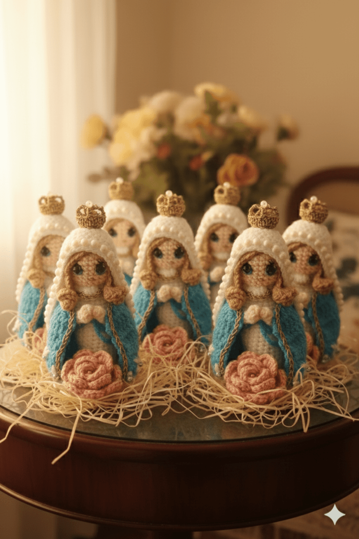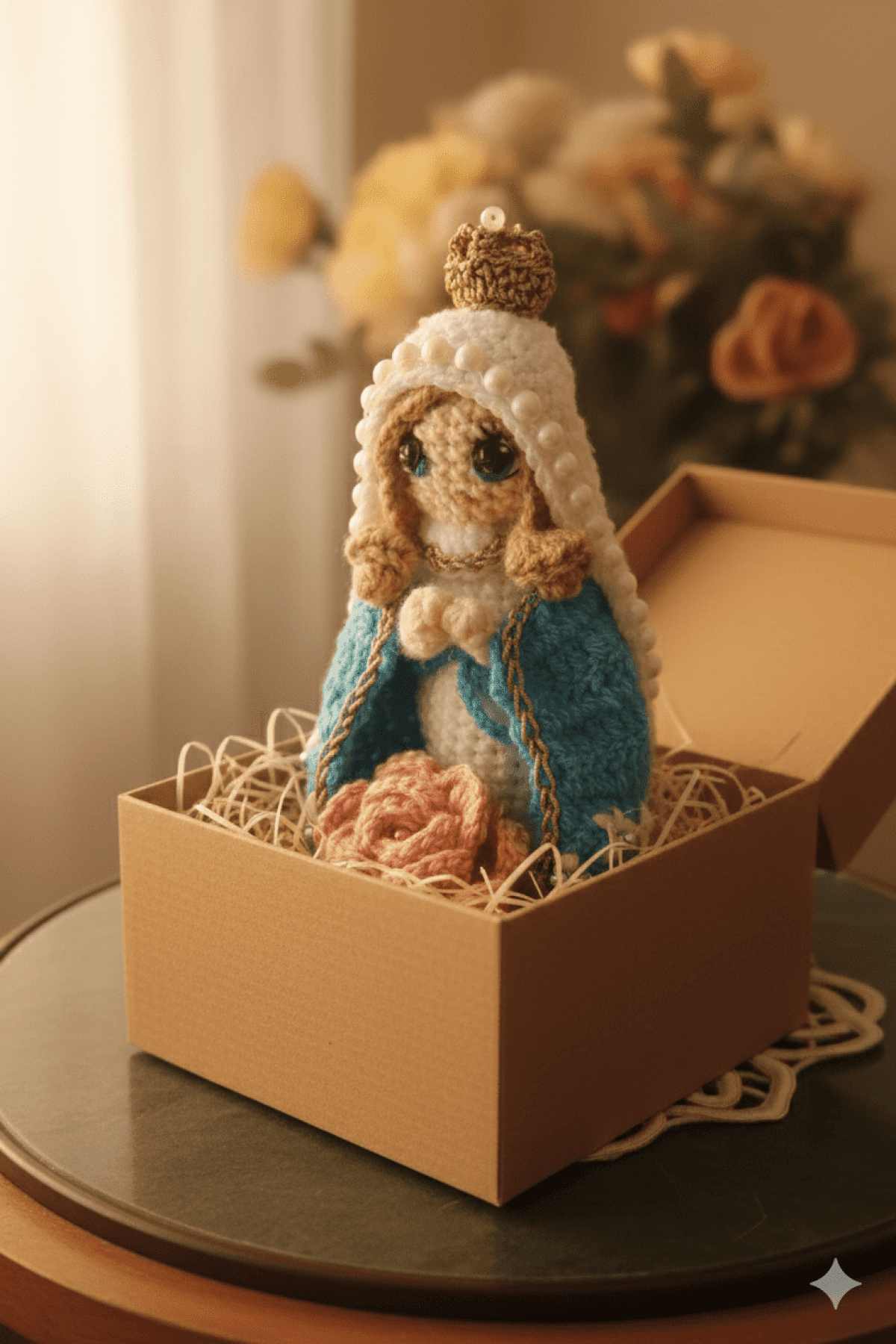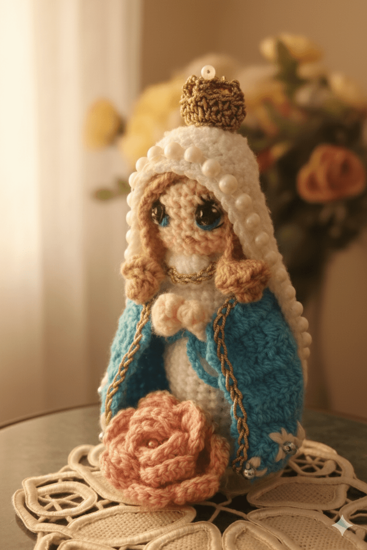 تمثال للعذراء كروشيه بثوبها الابيض واللبنى وغطاء للرأس بفصوص بيضاء وشعر بنى فاتح وعيون مطرزه يدويا وايضا الردا,ء عليه وردات مطرزه يدوياوامامها ورده كروشيه Acrochet statue of virgin mary wearing awhite and light blue dress with ahead covering adorned with white beads,light brown hair,and hand embrodiered eyes.the robe is decorated with hand embrodiered flowers,and in front of her there is acrochet flower.