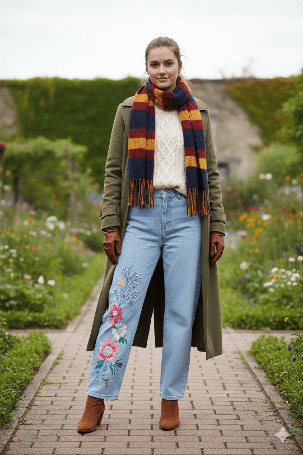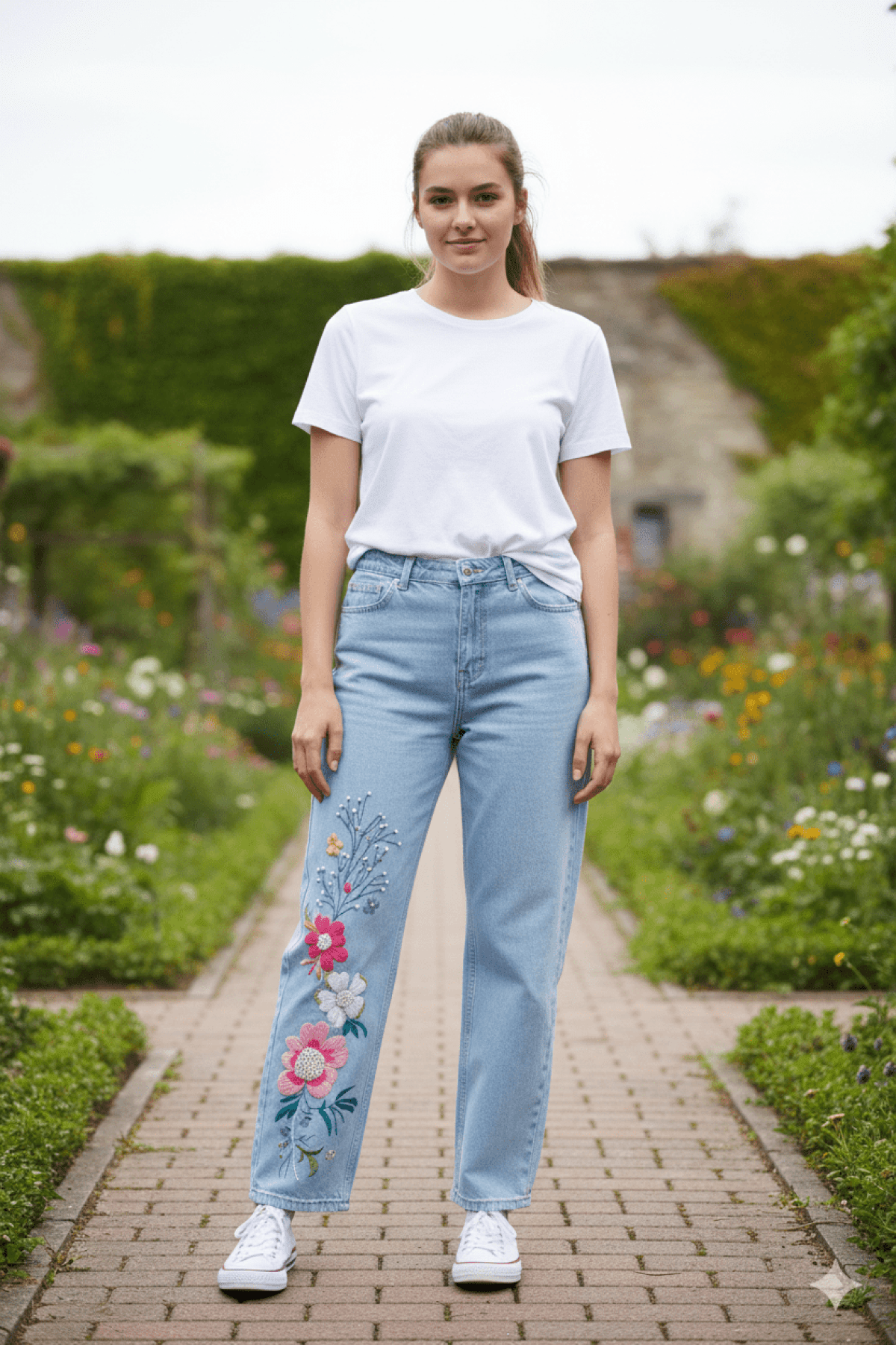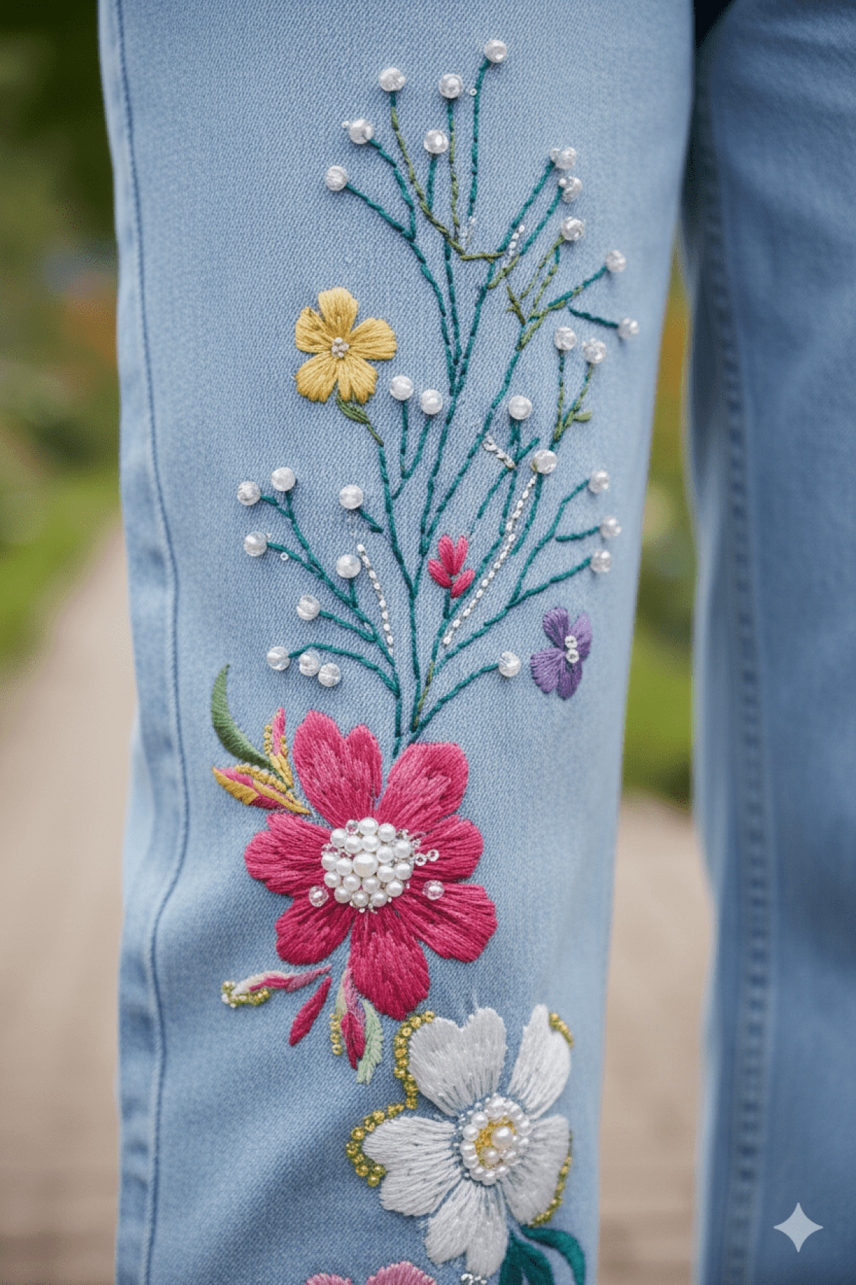 بنطلون جينز مطرز يدوى بوردات كبيره تتوسطها خرزات بيضاء وافرع من الخرز اللامع متاح مقاسات Hand-embrodiered jeans featuring large floral motifs accented with white trims and branches of shimmerng beads.Avaliable in multiple sizes.
