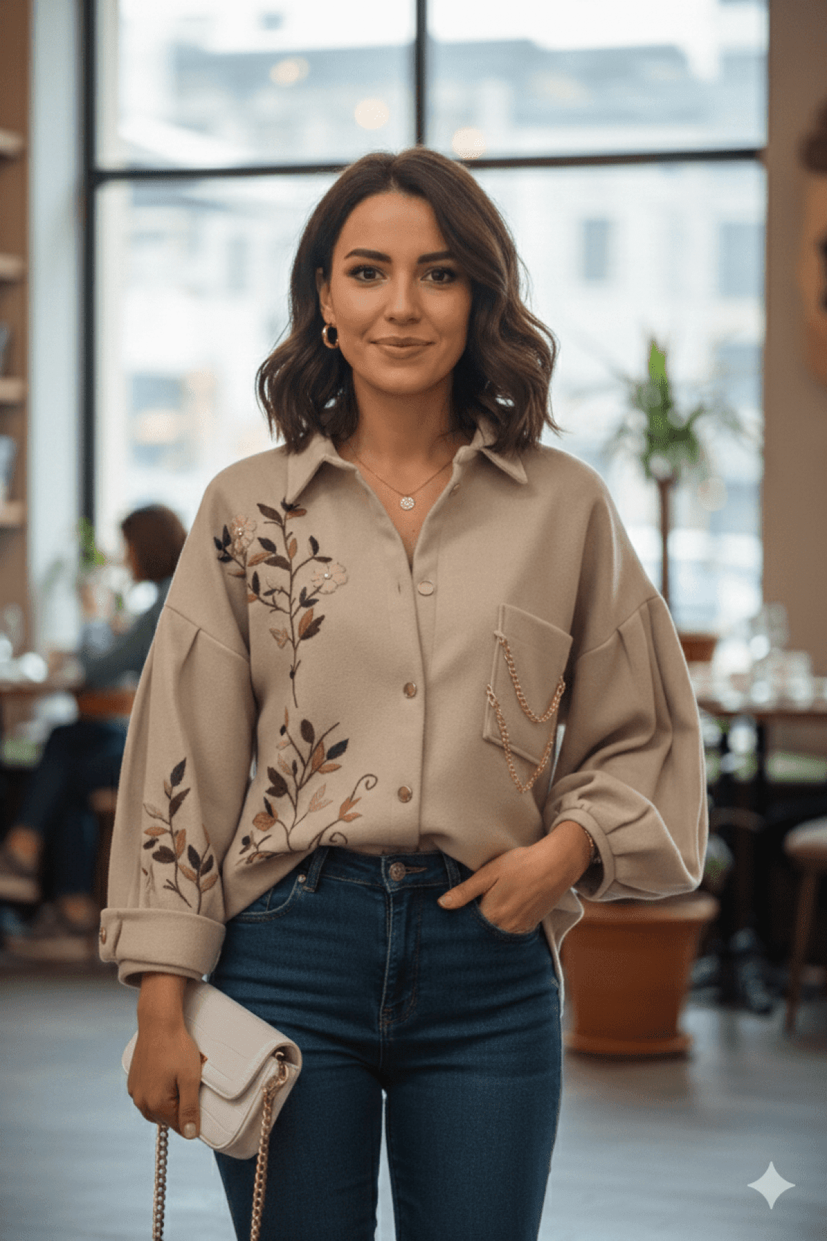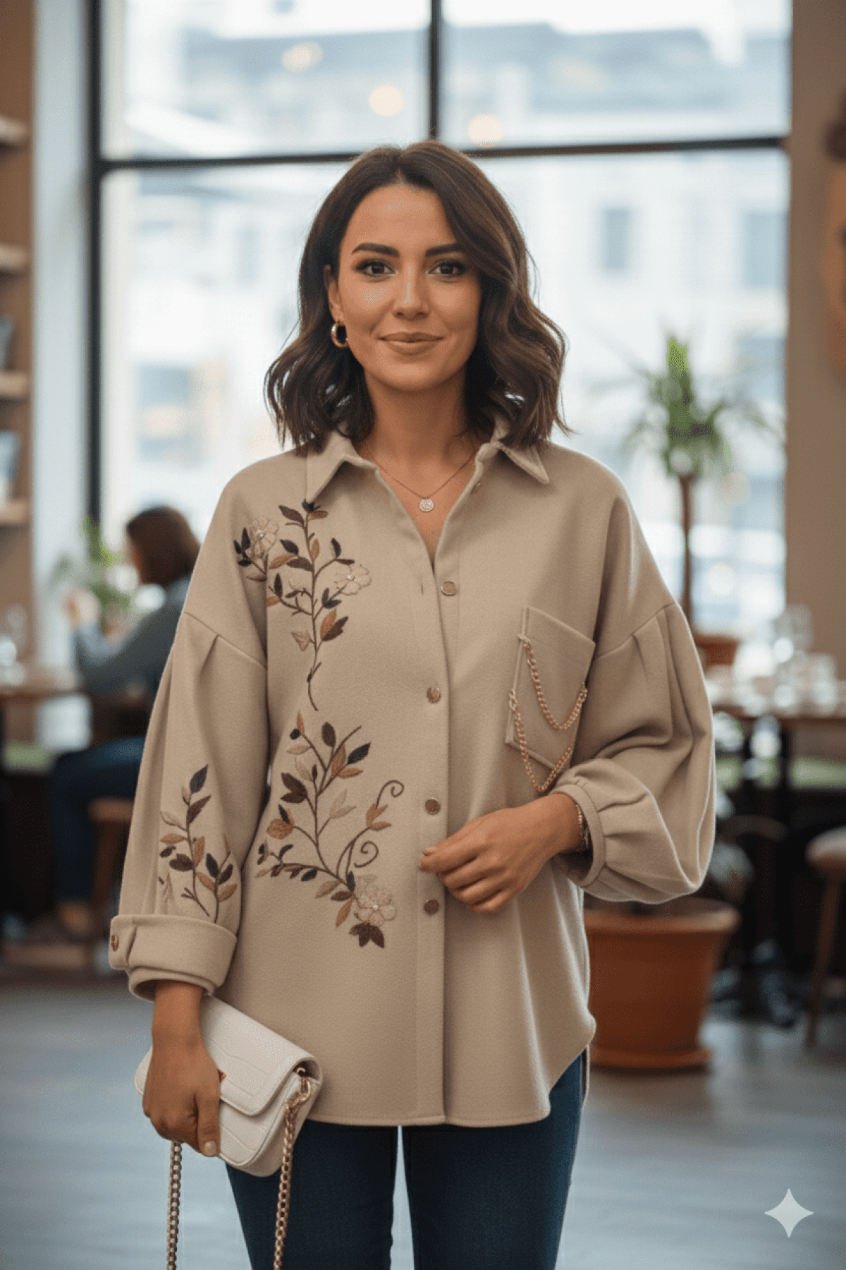 قميص قماشه تقيله جوخ كمام نازله عن الكتف جيب به ٢ سلسله دهبيه اللون والجهه الآخرى من القميص تطريز يدوى بفروع بيج وبنى ودهبى والكم من نفس الجهه مطرز الطول من أمام اقصر قليلا من خلف ٧٥سم عرض من الابط للابط ٧٥ AShirt made of heavy woolen fabric,featuring off -shoulder sleeves.on side have apocket adorned with two gold coloured chains,while the other side is decorated with handmade embrodiery in ,beige,brown ,and gold branches with the sleeve in that same side also embrodiered.the front length is slightly shorter than the back measuring 75cm The width from underarm to underarm 75cm.