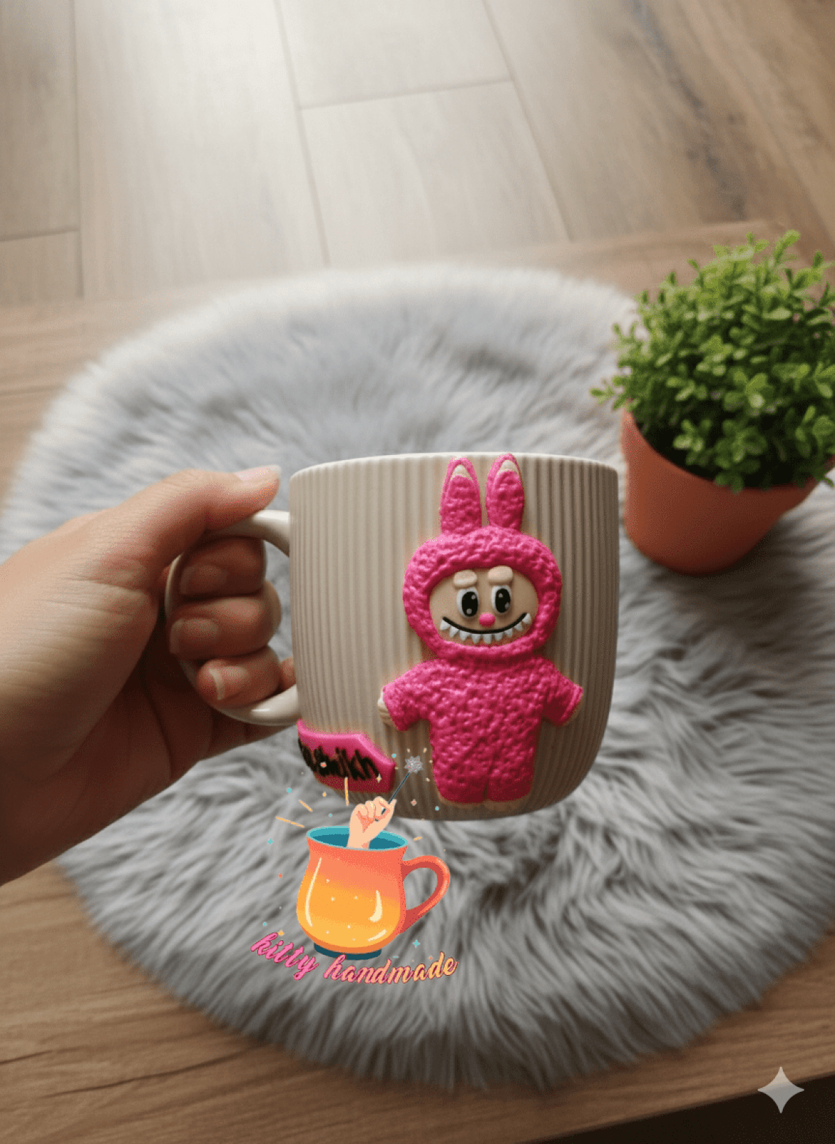 mug with a polymer clay design. Usage instructions: Do not microwave or dishwasher safe. Do not leave in a basin of water.