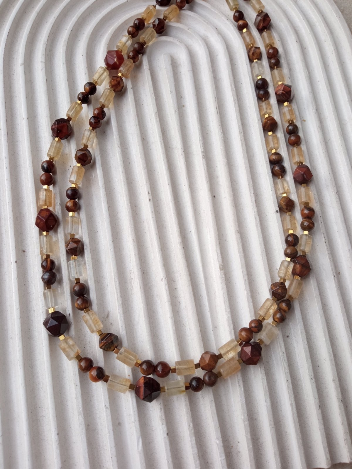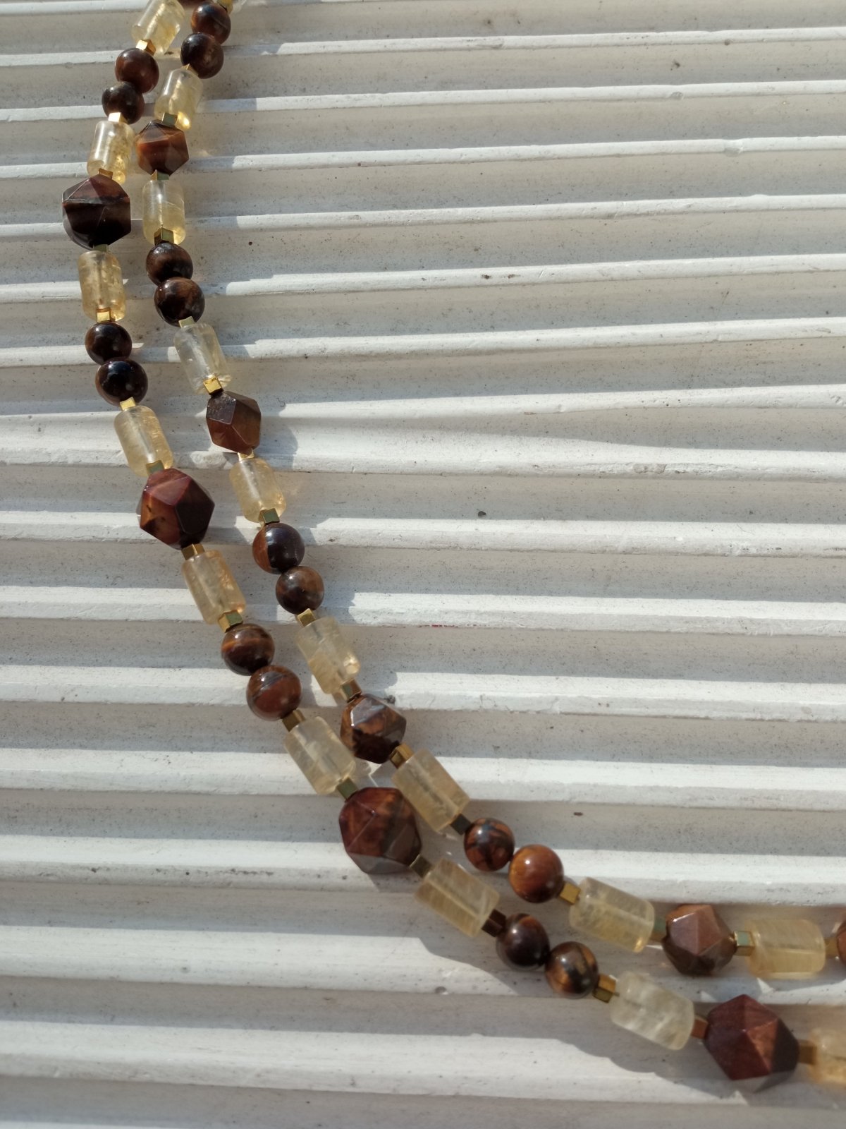 This one-of-a-kind double-layered necklace is a masterpiece of natural warmth and grounding energy. It features a sophisticated blend of honey-hued Citrine, known as the stone of abundance, and Tiger Eye, famous for its protective qualities and silky luster. The design is structured with faceted Hematite spacers that add a modern, metallic edge to the earthy stones. With its dual layers, this piece offers a rich, full look that transitions perfectly from professional daywear to elegant evening attire. Materials: Citrine, Tiger Eye, and Hematite spacers. Style: Double-layered artisan strand. Availability: Exclusive 1-of-1 piece.