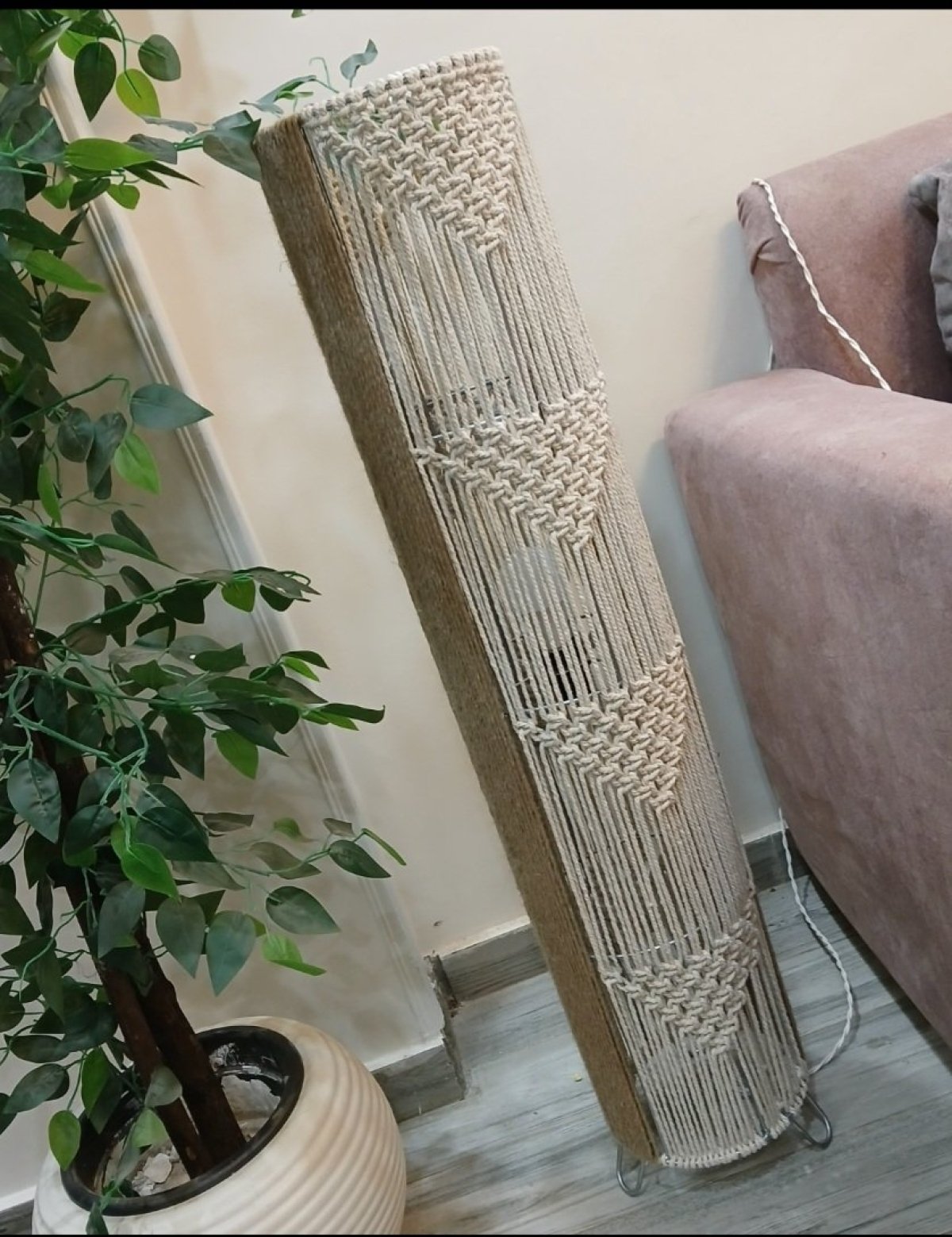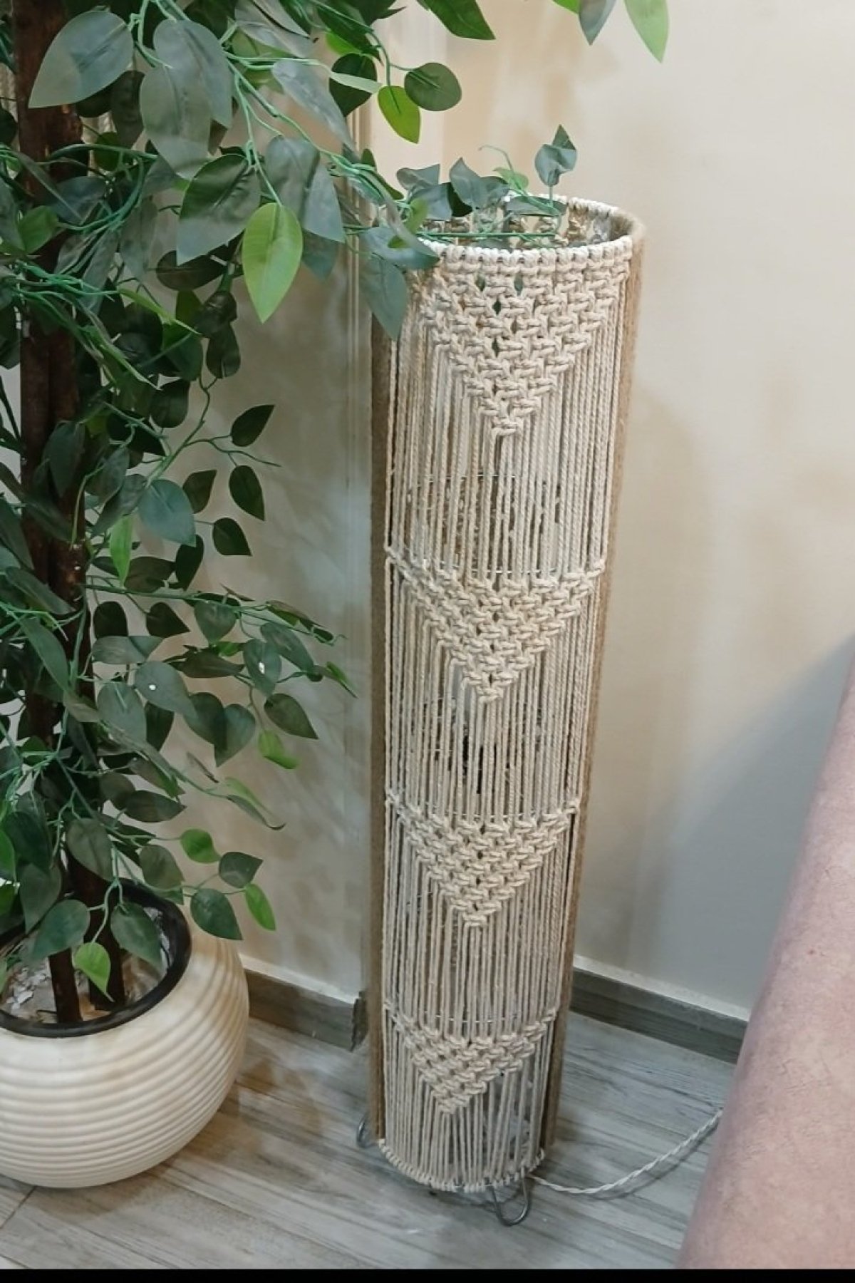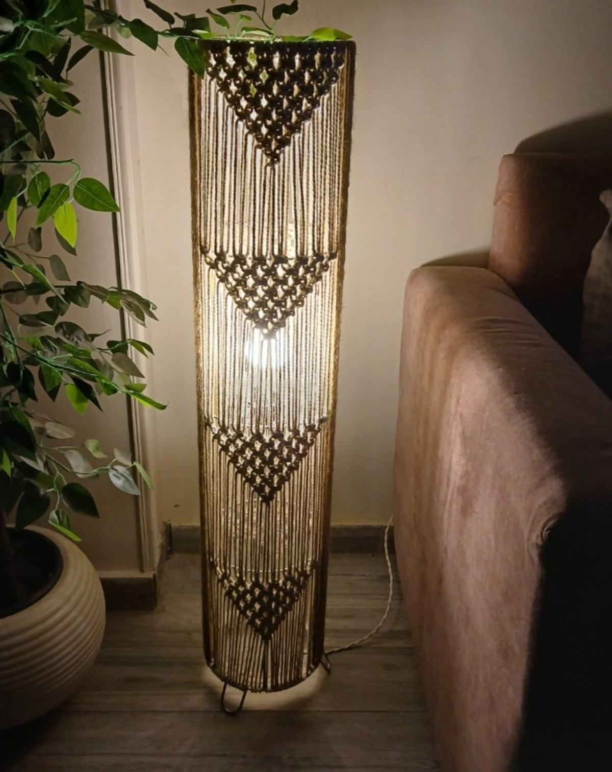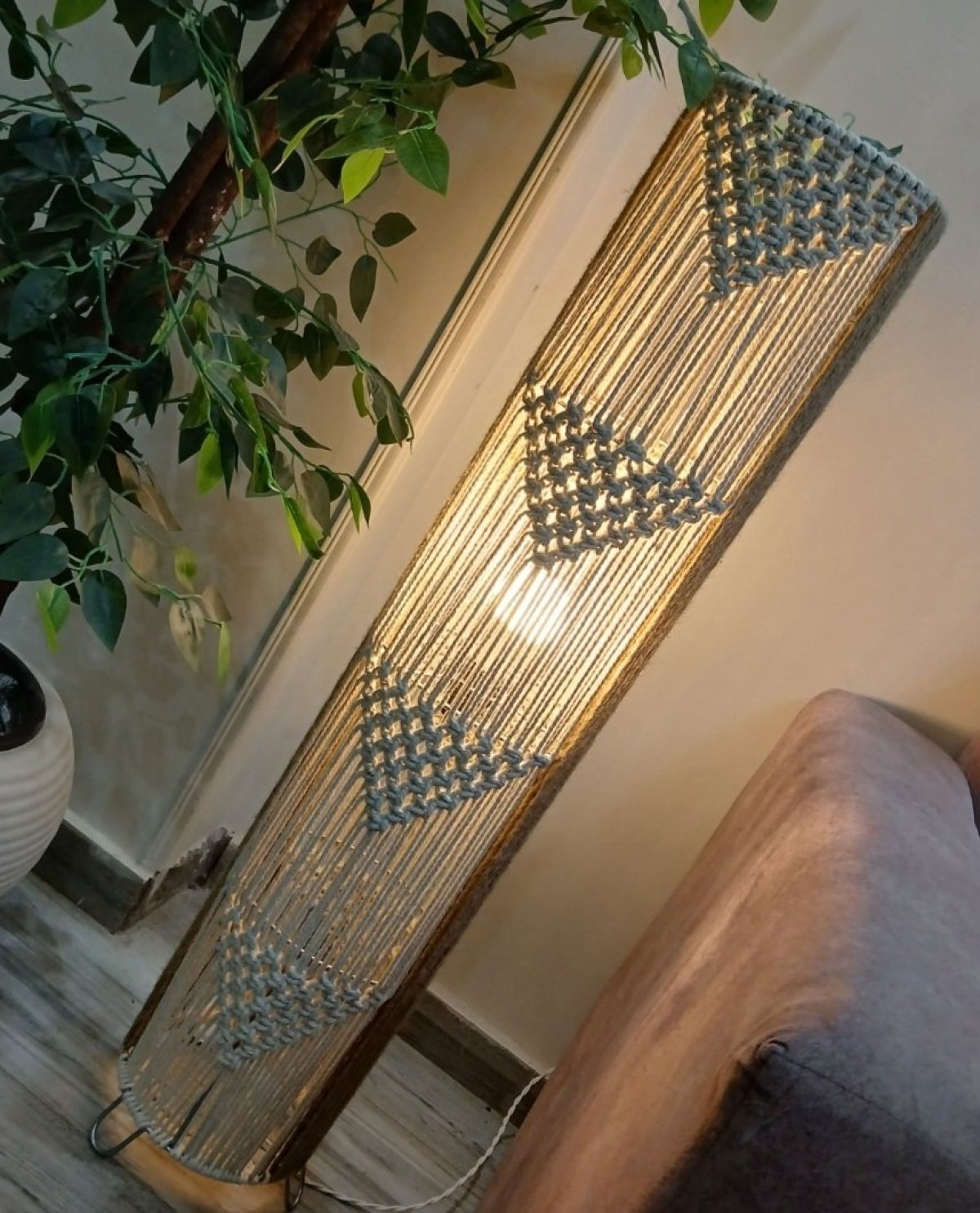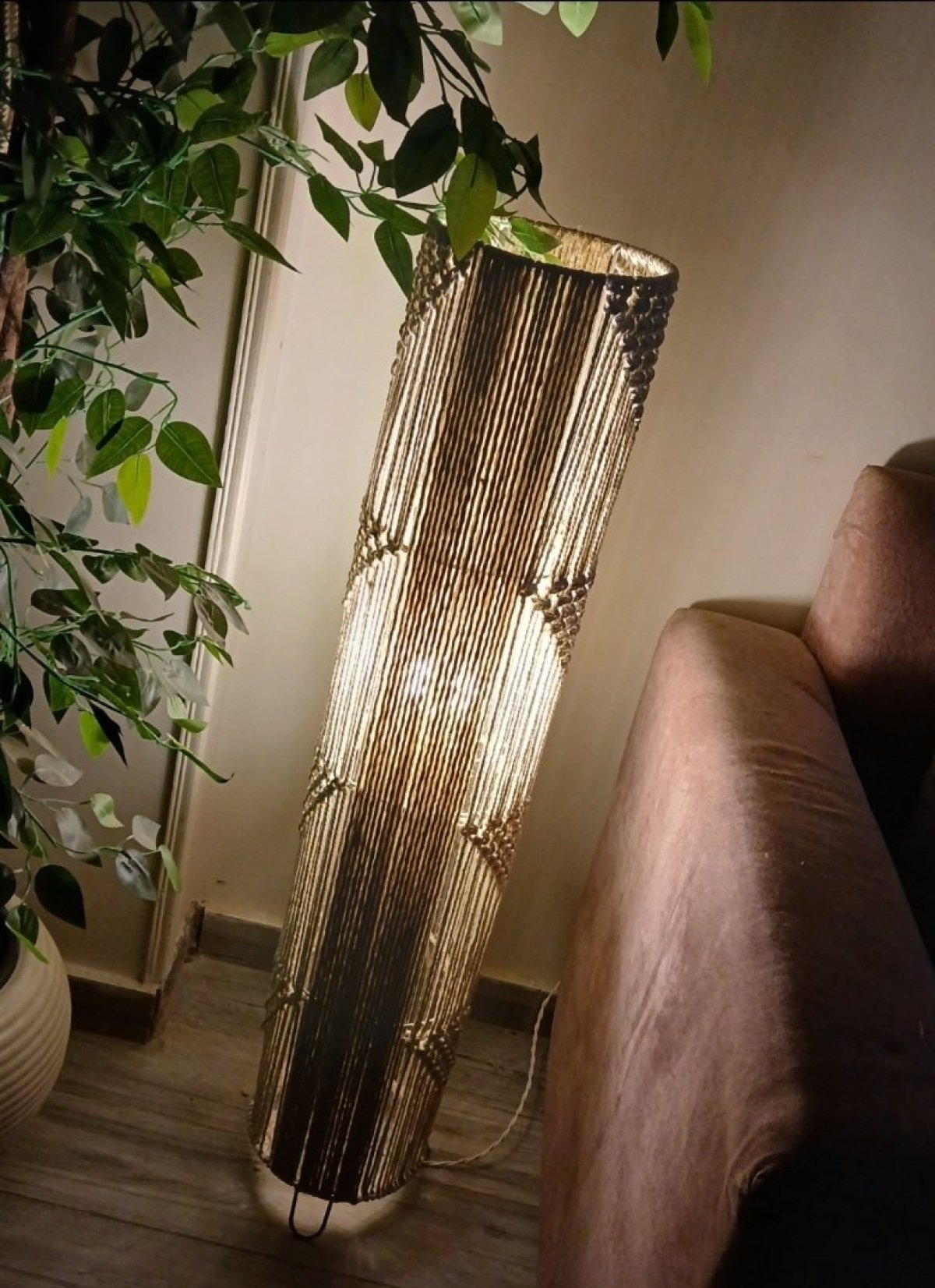 A one-meter metal light bulb. Made of burlap and cotton macrame.