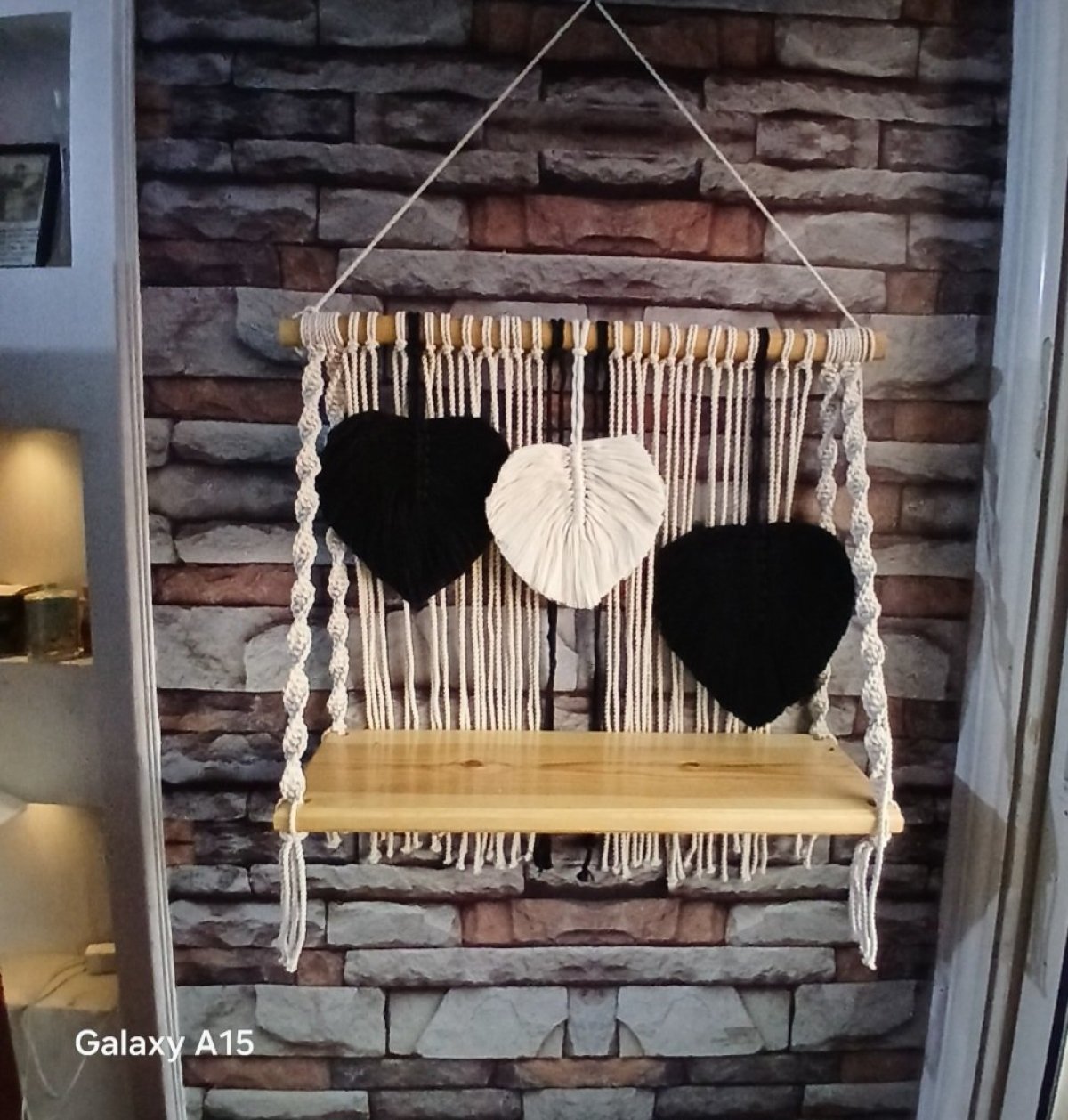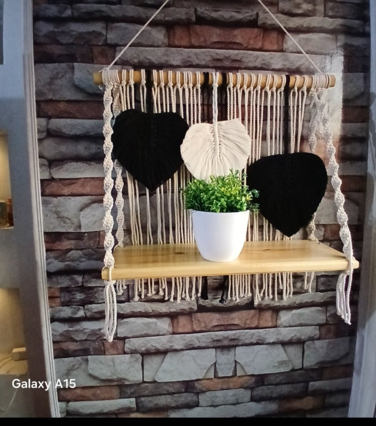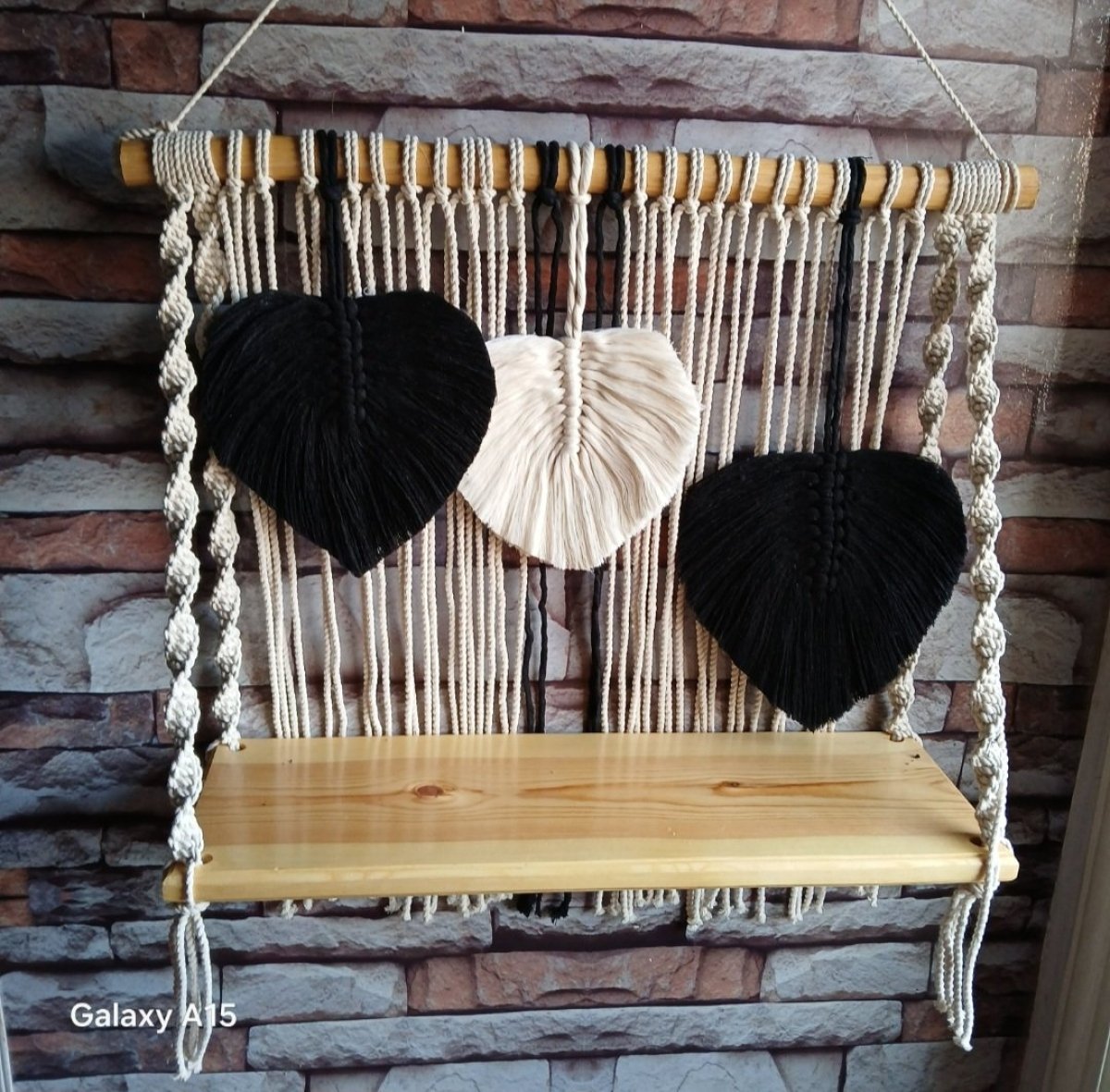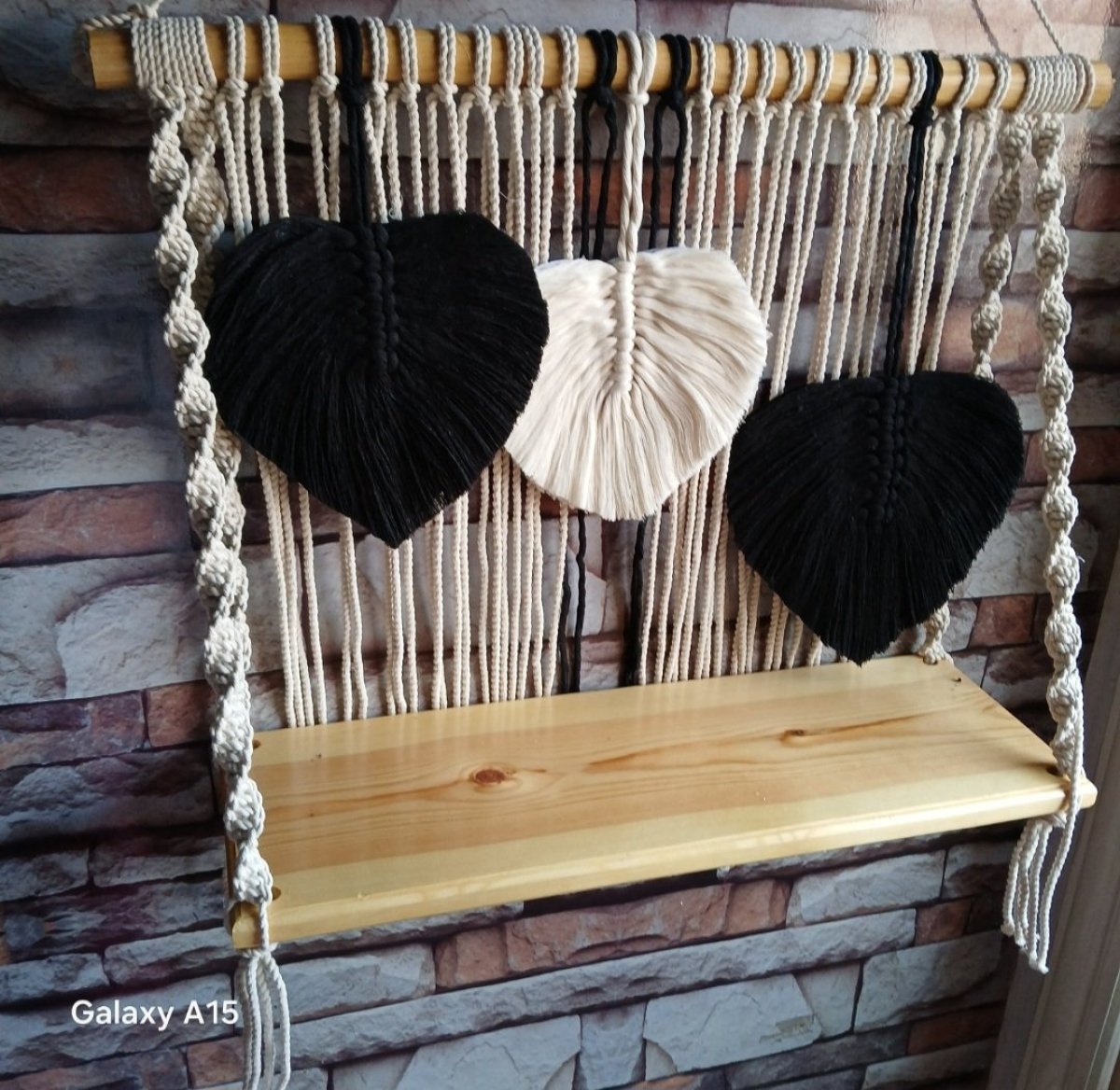 A macrame shelf made of natural wood, with a leaf pattern made of the finest yarn. Size 60 cm .