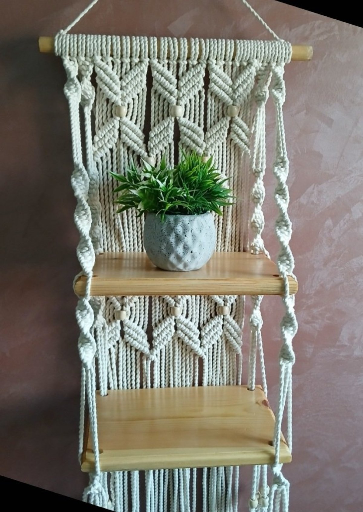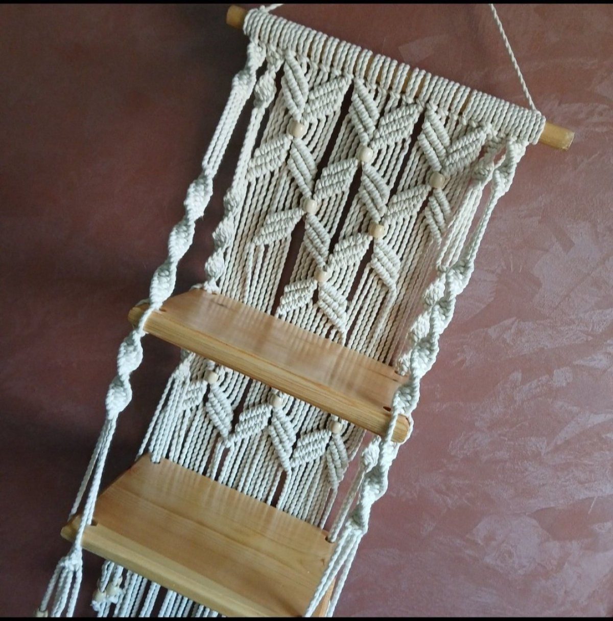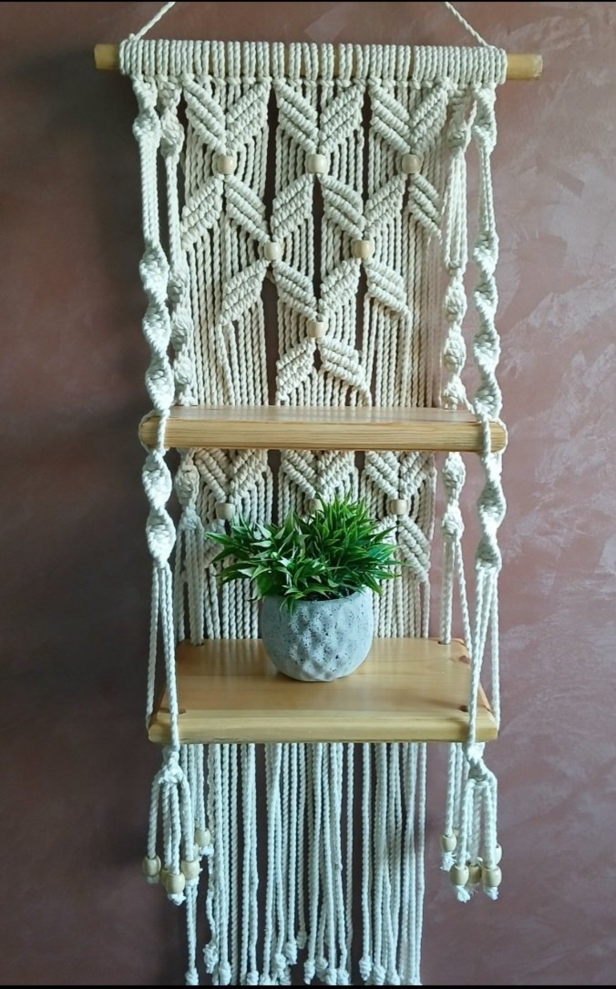 A macrame shelf made of natural wood, with a leaf pattern made of the finest yarn. Size 30 cm .