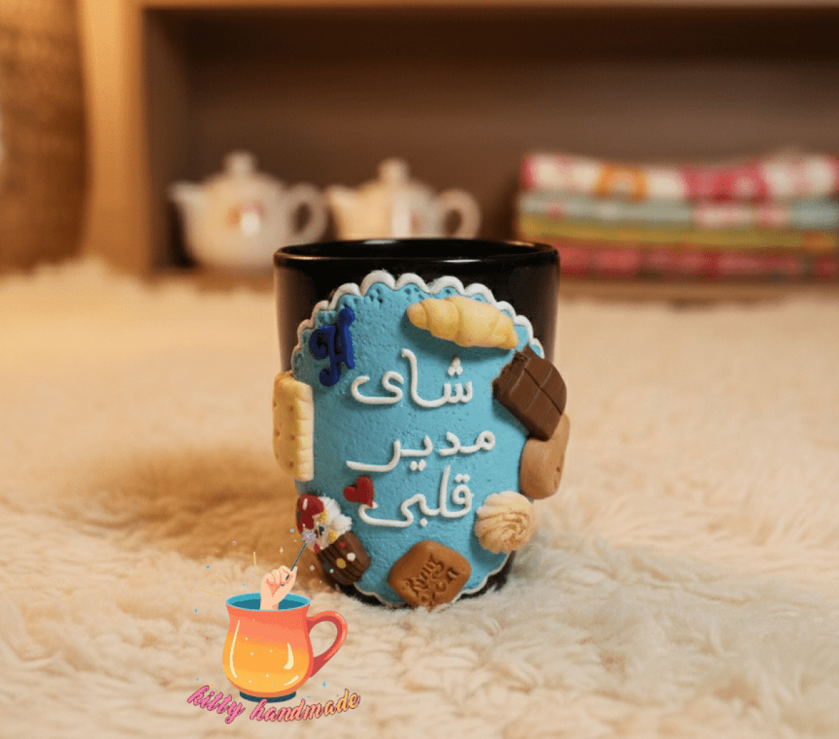 mug with a polymer clay design. Usage instructions: Do not microwave or dishwasher safe. Do not leave in a basin of water.