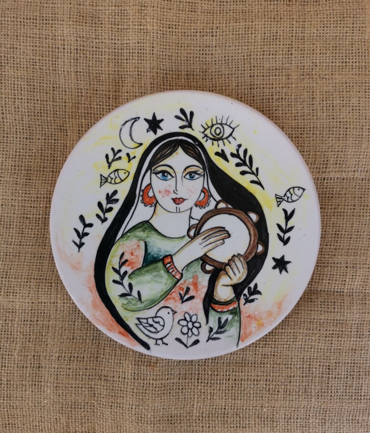 Circular ceramic plate, approximately 20 cm in diameter, hand-painted with a decoration inspired by folk art. It is used for decoration and is suitable for serving food and for use in the microwave.