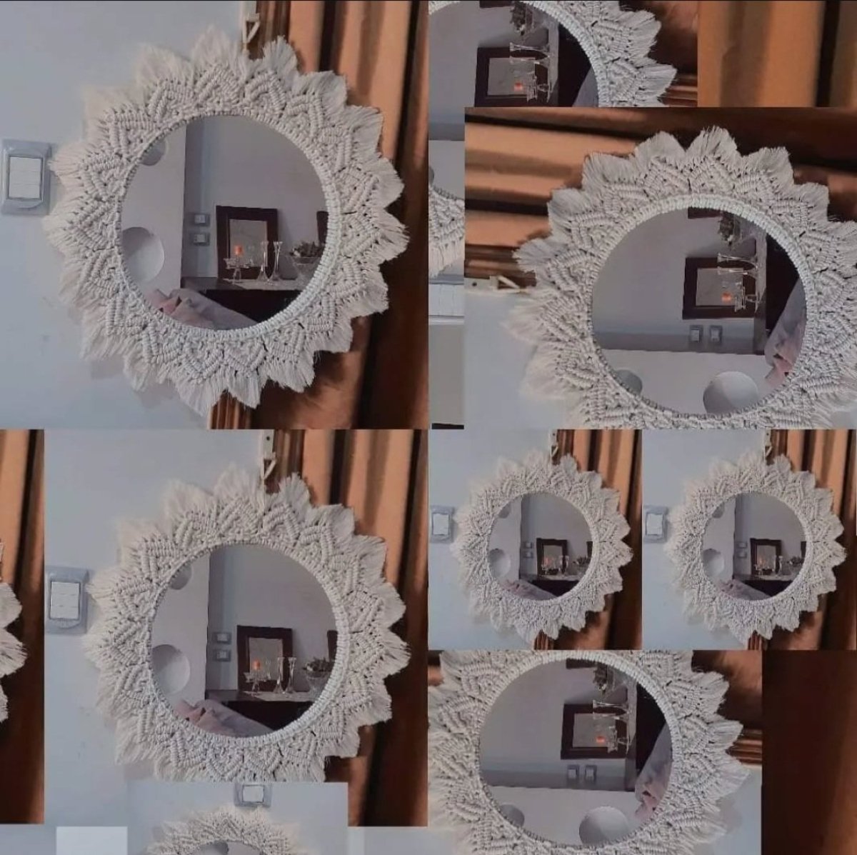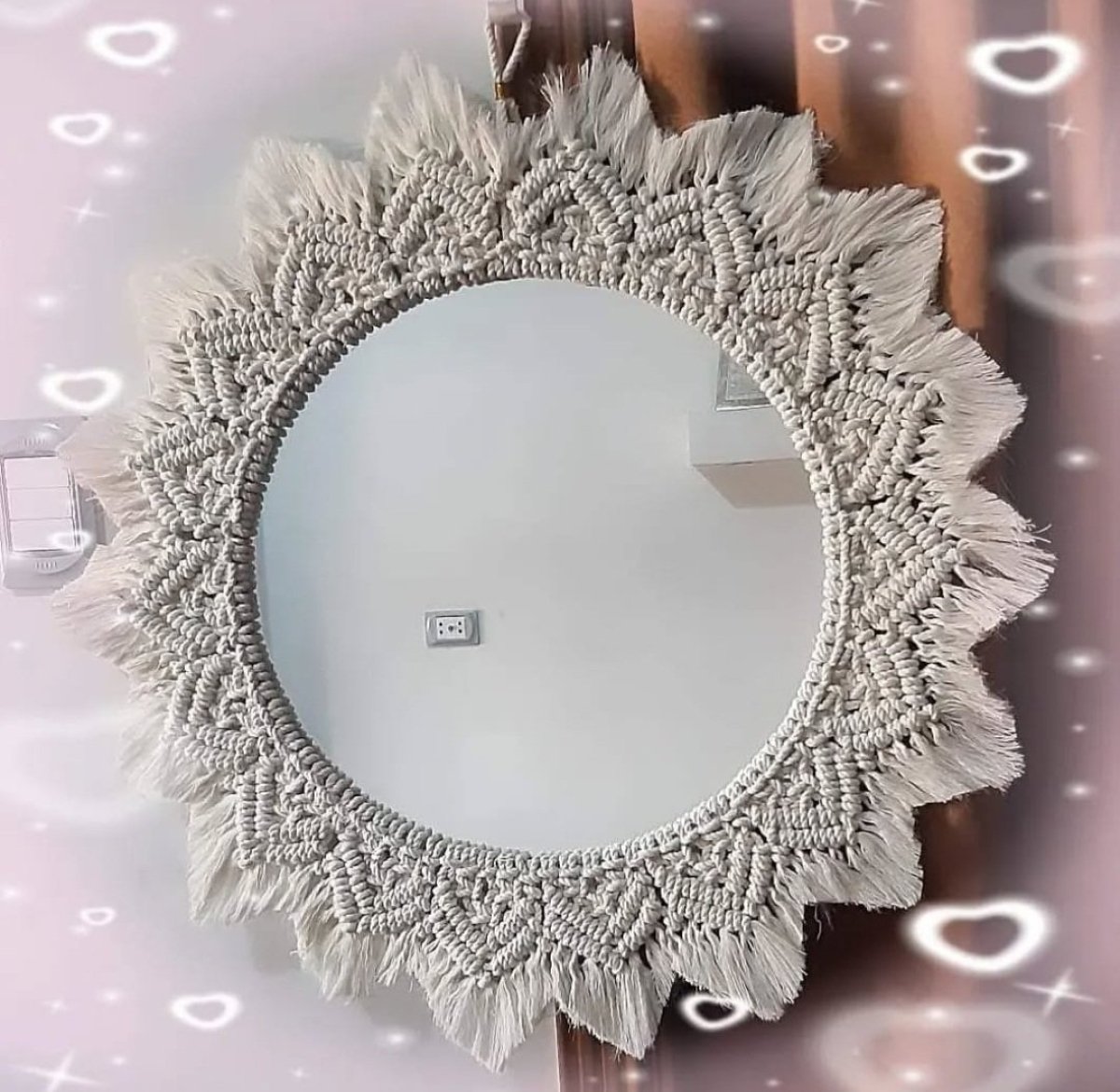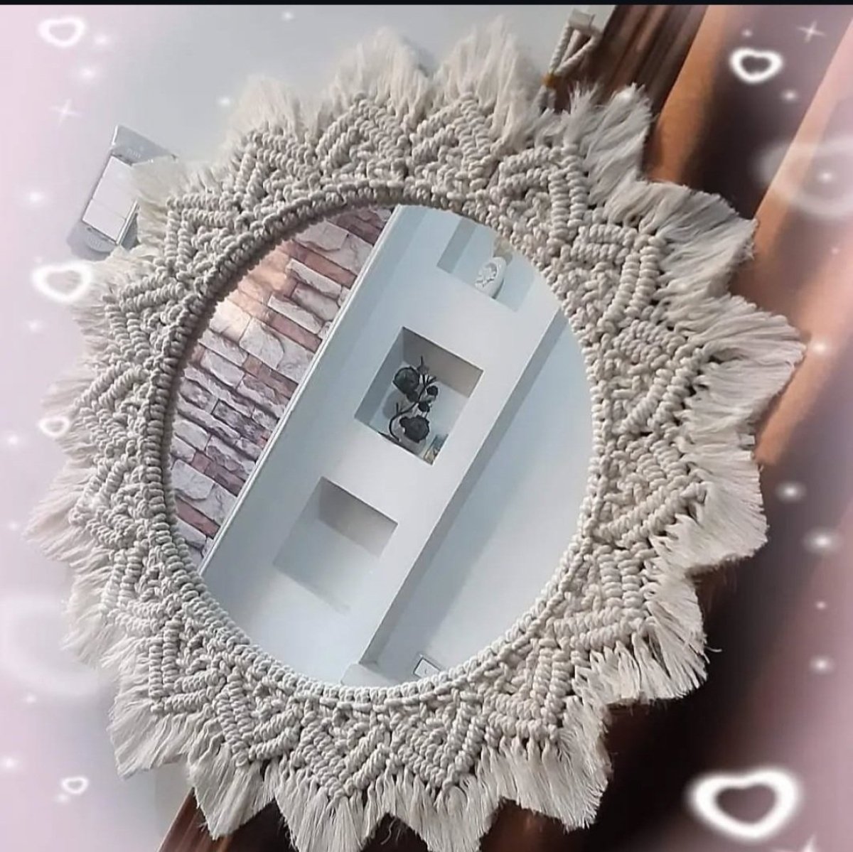 Handmade macramé wall mirror with white cotton rope, round boho decor mirror with modern woven tassels for living room and bedroom Size 60 cm .